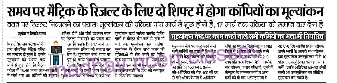 बिहार विद्यालय परीक्षा समिति द्वारा संचालित मैट्रिक परीक्षा का समाप्त हो चुका है और बता दें इस बार आपका मैट्रिक परीक्षा में 1648000 छात्र छात्राओं ने भाग लिया था और उन सभी का रिजल्ट बिहार बोर्ड के द्वारा 27 से 30 मार्च के अंदर देने की बात बताई गई है यह देश है बिहार बोर्ड के द्वारा अभी तक कंफर्म बताया गया है फाइनल डेट माना जाता है लेकिन 17 मार्च के बाद क्या होता है तो इसकी जानकारी भी आपको देखने को मिल जाएगा तो बता दें कि आप लोग का मूल्यांकन की कार्य बिल्कुल समाप्त होते ही टॉपर जो बनते हैं उनका वेरिफिकेशन होगा उनको लाइव कॉल पर बातचीत किया जाएगा तदुपरांत आपको रिजल्ट प्रकाशित किया जाएगा मूल्यांकन केंद्र पर काम करने वाले सभी कर्मियों को वेतन भी डबल दिए जा रहे हैं जिससे कि समय से उनका कॉपियों का मूल्यांकन हो सके इसके लिए बिहार बहुत ही सतर्कता से और अथक प्रयास है समय से जारी कर इतिहास बनाएं
