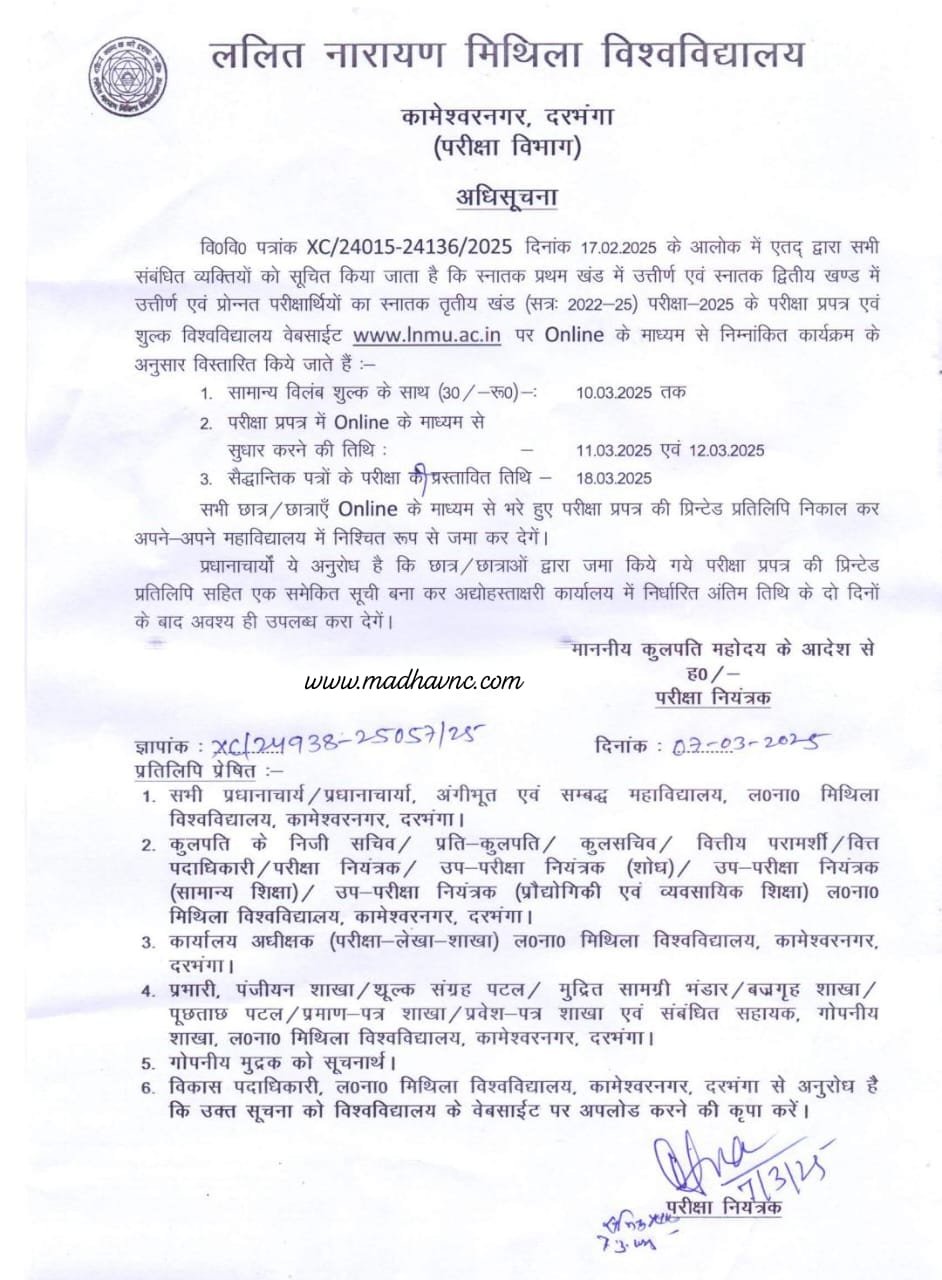 ललित नारायण मिथिला यूनिवर्सिटी के द्वारा स्नातक पार्ट 3 परीक्षा फॉर्म भरने और सुधार करने के लिए करके एक बार फिर से मौका दे रहा है | जो भी छात्र-छात्रा अभी तक परीक्षा फॉर्म नहीं भर पाए हैं | वह सभी LNMU Part-3 Exam 2022-25 परीक्षा फॉर्म को निर्धारित तिथि के अंदर ही भर लेंगे, कब तक आप परीक्षा फॉर्म भर सकेंगे और सुधार कर सकेंगे| इसकी पूरी जानकारी इस आर्टिकल में आपको हम देने वाले हैं | अगर आप पार्ट 3 के छात्र-छात्राएं हैं, तो इस आर्टिकल को पूरा पढ़िए और यह Article अगर आपको अच्छा लगे तो इससे आगे भी शेयर कीजिए ताकि दूसरे को भी या ब्रेकिंग न्यूज़ देखने को मौका मिले|
