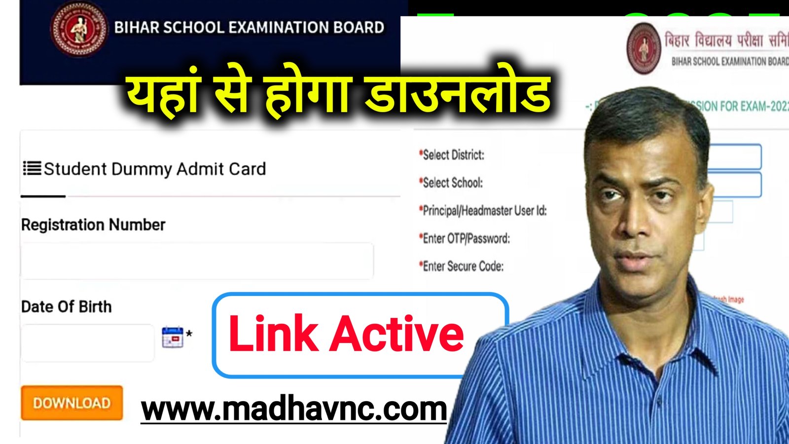संबंधित विद्यालय के प्रधान अपने पूर्व से प्राप्त यूजर आई०डी एवं पासवर्ड का प्रयोग करते हुए समिति की वेबसाईट http://secondary.biharboardonline.com पर बायें तरफ उपलब्ध लिंक “Examination Application Form For Exam, 2025” Click here to proceed Click here to apply/view पर Click कर Login करेंगे। लॉग-इन उपरान्त अपने विद्यालय के सभी छात्र/छात्राओं का Dummy Admit Card डाउनलोड कर सकते हैं।