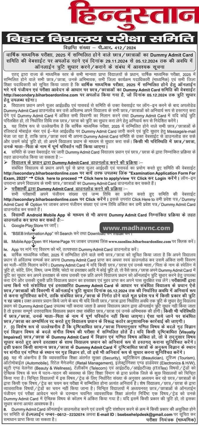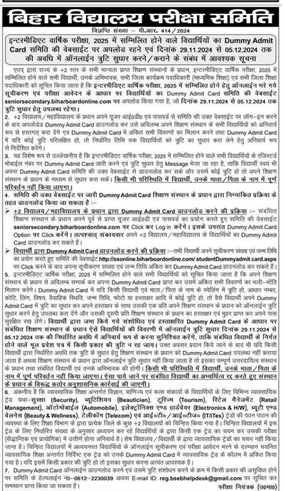 बिहार विद्यालय परीक्षा समिति इन्टरमीडिएट वार्षिक परीक्षा, 2025 में सम्मिलित होने वाले विद्यार्थियों का Dummy Admit Card समिति की वेबसाईट पर अपलोड रहने एवं दिनांक 29.11.2024 से 05.12.2024 तक की अवधि में ऑनलाईन त्रुटि सुधार करने / कराने के संबंध में आवश्यक सूचना
