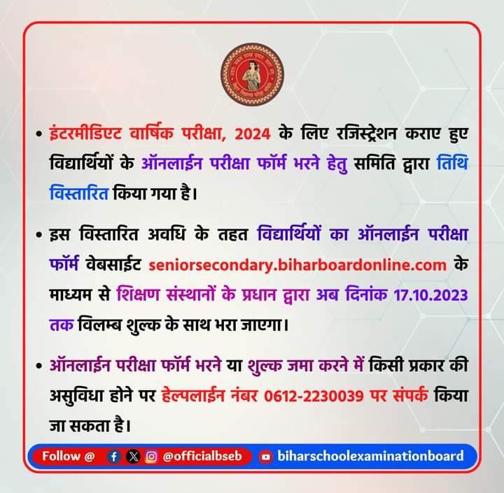 बिहार विद्यालय परीक्षा समिति के द्वारा मैट्रिक इंटर 2025 में होने वाली बोर्ड परीक्षा के लिए अंतिम रूप से पंजीयन करने का मौका दे दिया गया है | इस अवसर को सभी छात्रों तक पहुंचा दे | इसके लिए आप तमाम पढ़ने वाले लोगों से गुजारिश है |कि इस न्यूज़ को सभी ग्रुप में अवश्य भेजें| ताकि जो विद्यार्थी अभी तक मैट्रिक या इंटर के हैं, और उन्होंने अभी तक अपना रजिस्ट्रेशन सुनिश्चित नहीं कराए हैं|