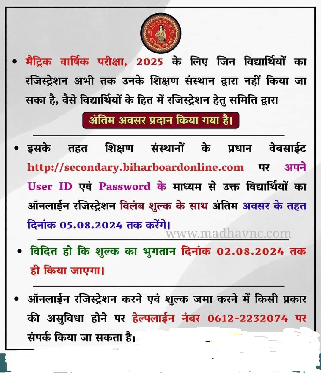 बिहार विद्यालय परीक्षा समिति पटना के द्वारा इंटर मैट्रिक रजिस्ट्रेशन करने का अंतिम अवसर 5 अगस्त तक दिया गया है| जिसके लिए ऑफिसर सूचना भी जारी किया गया है| ऑफिशियल सूचना के अनुसार सभी संबंधित स्कूल कॉलेज को बताया गया है| कि बिहार बोर्ड के ऑफिसियल वेबसाइट जहां से रजिस्ट्रेशन होना है| वहां जाकर के यूजर आईडी और पासवर्ड से लॉगिन हो करके जो विद्यार्थी छूते हुए हैं| उनका रजिस्ट्रेशन करें इसके लिए सभी स्कूल कॉलेज में सूचना निकले|
