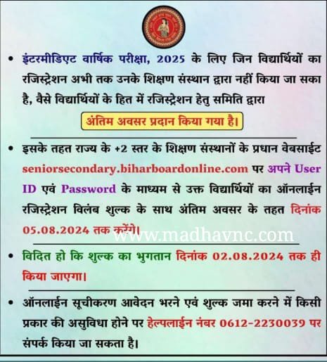 बिहार बोर्ड परीक्षा 2025 में भाग लेने वाले सभी छात्र-छात्राओं के परीक्षा फॉर्म भरने से पहले पंजीयन अर्थात रजिस्ट्रेशन करने का अंतिम अवसर दिया गया है| जिसके लिए करके बिहार विद्यालय परीक्षा समिति के द्वारा ऑफिशियल सूचना भी जारी किया गया है| जिसके मुताबिक 5 अगस्त तक अतिरिक्त मौका दिया गया है| जो विद्यार्थी अभी तक रजिस्ट्रेशन नहीं कराए हैं| वह सभी रजिस्ट्रेशन अवश्य करें | क्योंकि इसके बाद परीक्षा फॉर्म भरा जाएगा| इसके बाद ही आपका एडमिट कार्ड जारी होगा| जो छात्र-छात्राएं पंजीयन नहीं करते हैं| उनके परीक्षा फॉर्म भरने से वंचित रखा जाएगा| इसके लिए छात्र स्वयं जिम्मेदार होंगे|