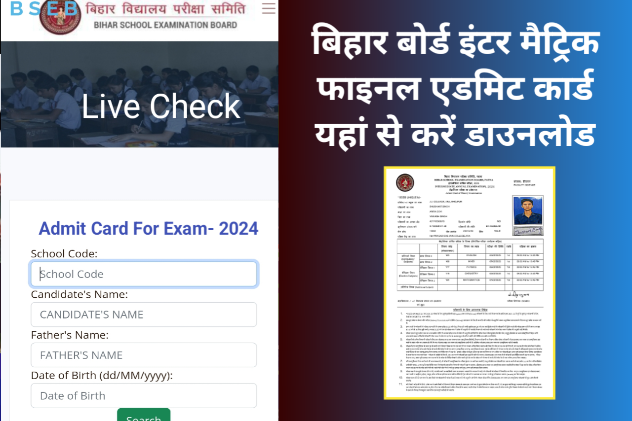 बिहार विद्यालय परीक्षा समिति के द्वारा मैट्रिक इंटर वार्षिक परीक्षा 2024 के लिए फाइनल एडमिट कार्ड जारी कर दिया गया है। इसे सभी छात्र छात्राएं, बिहार बोर्ड के ऑफिसियल वेबसाइट से
