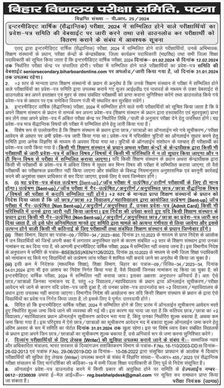 के माध्यम से अपना फाइनल एडमिट कार्ड डाउनलोड कर सकेंगे। इसके लिए कुछ दिन पहले ,Bihar Board Exam- 2024 Final Admit Card Download Link- बिहार बोर्ड के द्वारा स्कूल कॉलेज को भी लिंक प्रदान किया गया था । जिसके द्वारा स्कूल कॉलेज एडमिट कार्ड डाउनलोड कर छात्र-छात्राओं को प्रधानाध्यापक साहब के सिग्नेचर मोहर के साथ प्रदान करेंगे। इसकी जानकारी बिहार बोर्ड के द्वारा दे दी गई थी, और इसके लिए ऑफिशल नोटिस भी जारी की गई थी।
