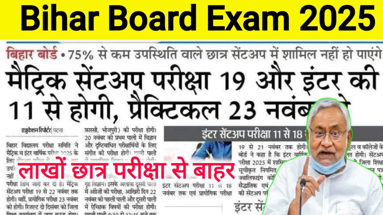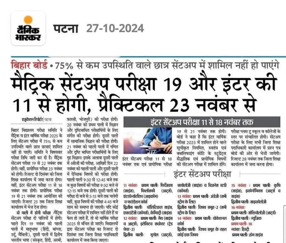 बिहार विद्यालय परीक्षा समिति के द्वारा इंटर मैट्रिक वार्षिक परीक्षा 2025 का आयोजन फरवरी माह में किया जाएगा| इंटर Sent-up Exam परीक्षा का आयोजन 11 सितंबर से होने वाली है, वही 10वीं अर्थात मैट्रिक Sent-up Exam 2024-25 का आयोजन 19 नवंबर से हो रहा है| जो 22 नवंबर तक चलने वाली है|
