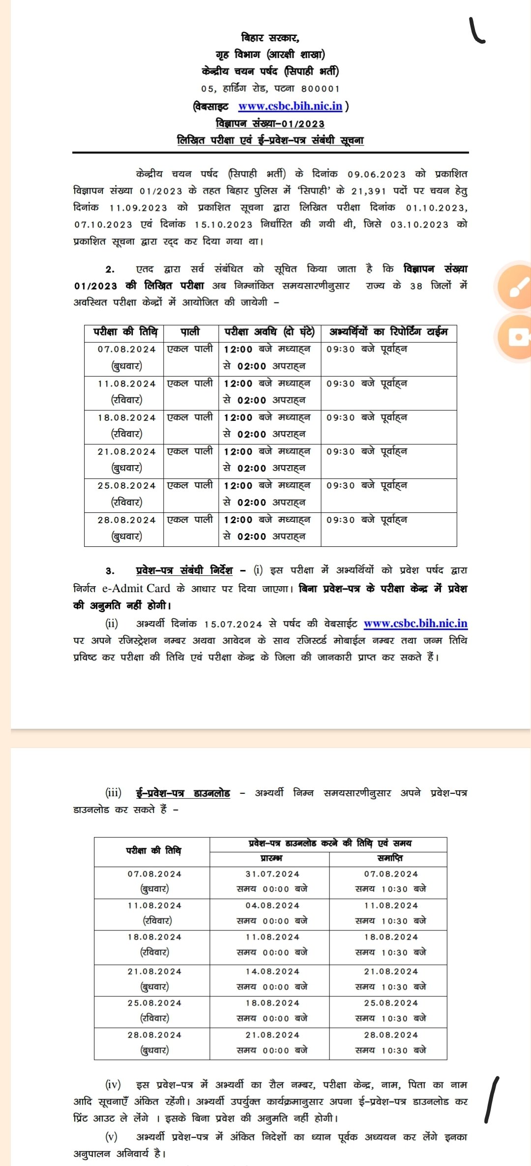 दोस्तों आप सभी के जानकारी के लिए बताने बिहार पुलिस परीक्षा के लिए ऑफिशियल सूचना भी जारी किया गया जिसके मुताबिक 7 अगस्त से 28 अगस्त तक परीक्षा लिया जाना है | जिसके लिए अलग-अलग तिथियां को एडमिट कार्ड जारी किया जाना है इस वर्ष परीक्षा बिल्कुल रूप से कदाचार मुक्त होगी परीक्षा में किसी भी प्रकार की चोरी का नामोनिशान भी नहीं रहने वाला है|