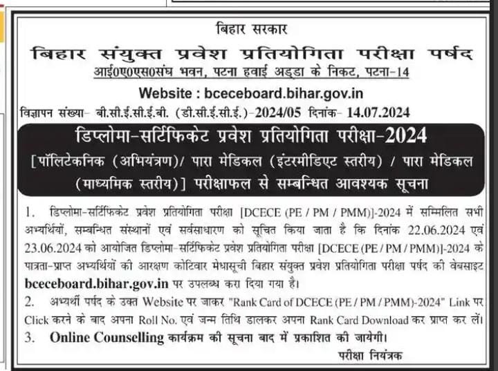 Bihar पालीटेक्निक Results जारी 2024 : बिहार पॉलिटेक्निक प्रवेश परीक्षा रिजल्ट जारी स्कोर कार्ड सबसे पहले यहां से डाउनलोड करें