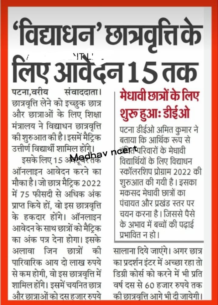 छात्रवृत्ति लेने को इच्छुक छात्र और छात्राओं के लिए शिक्षा मंत्रालय ने विद्याधन छात्रवृत्ति की शुरुआत की है। इसमें मैट्रिक उत्तीर्ण विद्यार्थी शामिल होंगे।