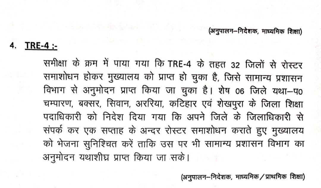 BPSC TRE-4 के तहत 32 जिलों का रोस्टर मुख्यालय को प्राप्त हो चुका है।सामान्य प्रशासन विभाग से मंजूरी भी मिल गई है, बाकी बचे 6 जिलों को जल्द से जल्द रोस्टर भेजने का निर्देश दिया गया है।