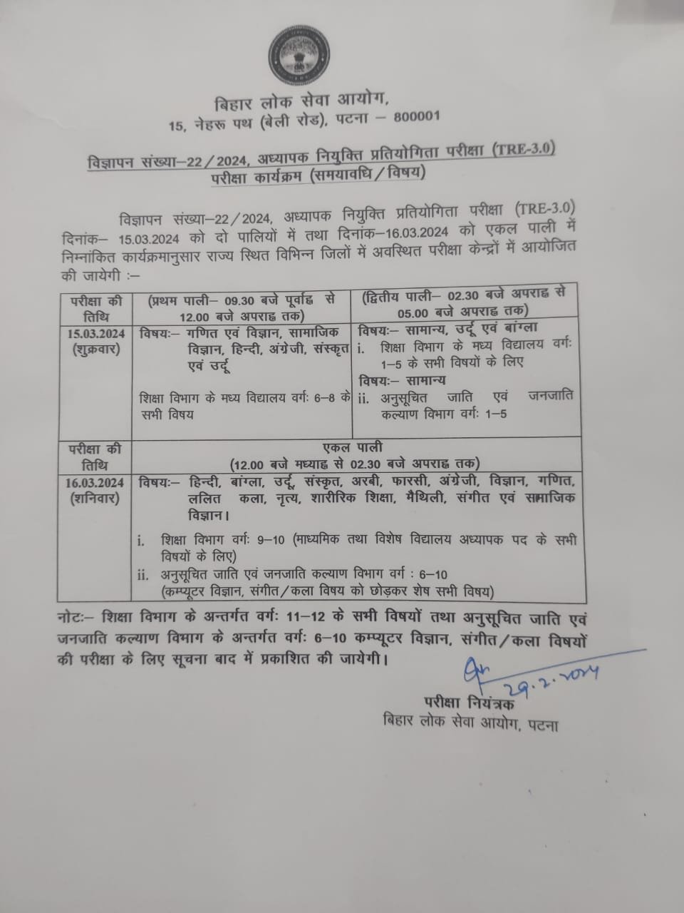 BPSC Tre 3.0 Exam 2024 Datesheet Out ;- बिहार लोक सेवा आयोग द्वारा शिक्षक भर्ती परीक्षा तिथि जारी 15 मार्च और 16 मार्च को होगी परीक्षा