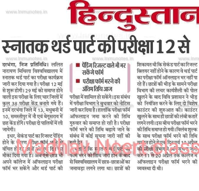 हेलो दोस्तों आप सभी का स्वागत है- मिथिला यूनिवर्सिटी के एक बहुत बड़े अपडेट में यह अपडेट LNMU greduation कर रहे सभी छात्र छात्रा के लिए बहुत ही महत्वपूर्ण है. जो भी मिथिला यूनिवर्सिटी से ग्रेजुएशन कर रहे हैं । चाहे वह पार्ट वन में हो या पार्ट 2 or पार्ट 3 किसी भी खंड में है ।