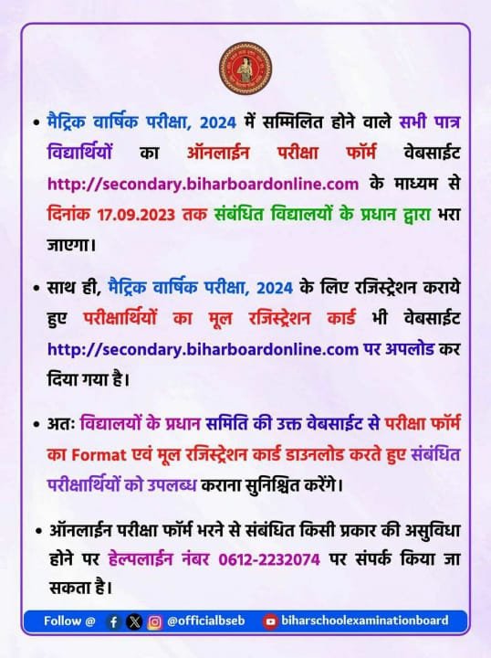 इसलिए समय रहते हुए परीक्षा फॉर्म इंटर वाले विद्यार्थी 9 सितंबर से पहले और मैट्रिक वाले विद्यार्थी 17 सितंबर से पहले आवश्यक रूप से भर ले ।  अगर परीक्षा फॉर्म समय पर नहीं भर पाते हैं। तो इसकी जिम्मेदारी विद्यार्थी और उनके अभिभावक होंगे जिम्मेदारी किसी भी हाल में नहीं होगी।