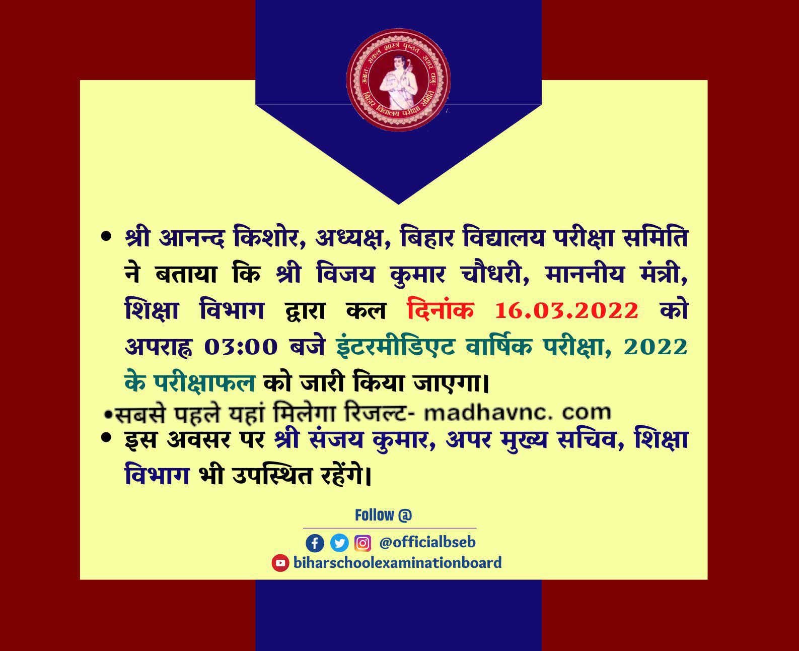 श्री आनंद किशोर अध्यक्ष बिहार विद्यालय परीक्षा समिति ने बताया कि श्री विजय कुमार चौधरी माननीय मंत्री शिक्षा विभाग द्वारा कल दिनांक 16 मार्च 2022 को शाम 3:00 बजे इंटरमीडिएट वार्षिक परीक्षा 2022 के परीक्षा फल को जारी किया जाएगा इसके लिए सबसे पहले रिजल्ट देखने के लिए आपको biharboardonline.com पर जाना होगा जहां पर आपको रोल नंबर रोल कोड मांगा जाएगा और कैप्चा भर कर अपना रिजल्ट देख सकते हैं