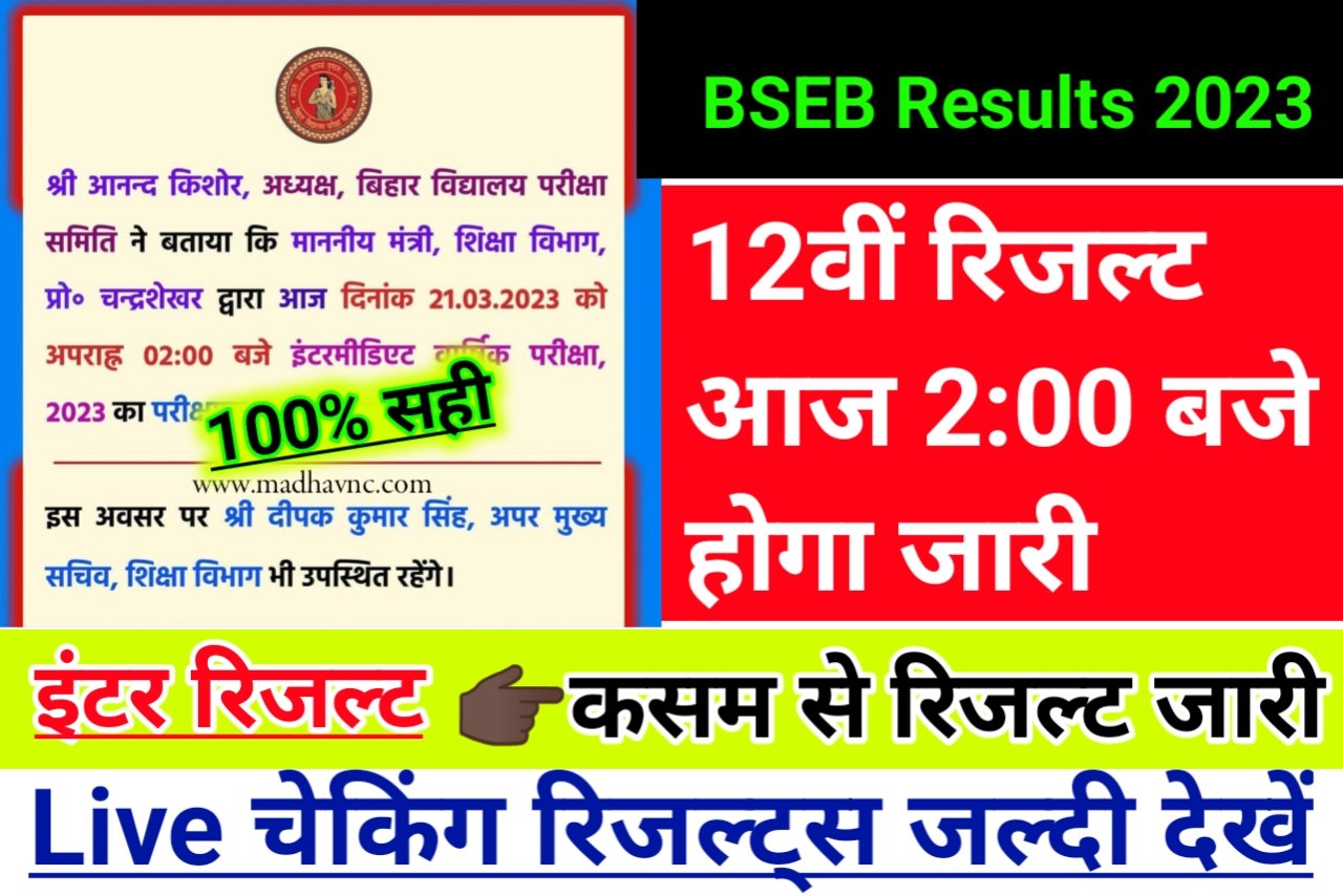 बिहार बोर्ड अध्यक्ष आनंद किशोर जी बिहार शिक्षा मंत्री ऑफिसर चंद्रशेखर एवं अन्य लोग की उपस्थिति में ऑफिशल नोटिफिकेशन जारी किया गया रिजल्ट आज दोपहर 2:00 बजे के बाद जारी किया जाएगा रिजल्ट जारी होते ही सबसे पहले बिहार बोर्ड की ऑफिशल साइट पर देखा जाएगा। हालांकि ऑफिशियल साइट काफी स्लो होने के कारण वहां पर समय अनुसार चेक रिजल्ट नहीं कर पाएंगे स्टूडेंट-  इसलिए www.madhavnc.com पर सबसे पहले बिना किसी परेशानी के रिजल्ट देखा जा सकेगा ।