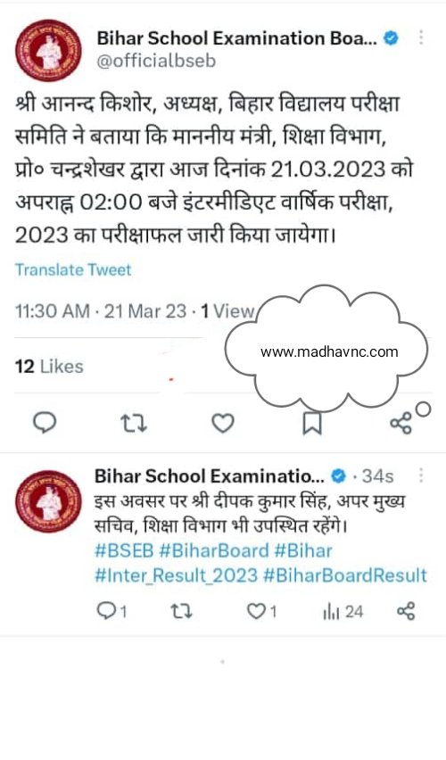 Bihar School Examination Board will release the result of Intermediate Annual Examination today at 2:00 PM. Official notification has been issued by the Bihar Board regarding the release of the result, as well as it was also told by tweeting that the result will be released today at 2:00 PM. Will be issued later. After the release of the result, it will be first seen on the official site of Bihar Board. Due to the slowness of the office site, the result can be checked on madhavnc.com.
