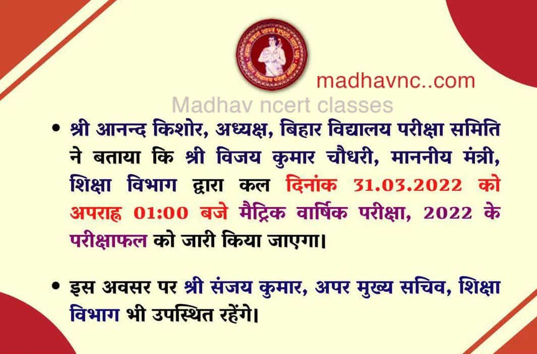बिहार विद्यालय परीक्षा समिति के द्वारा मैट्रिक रिजल्ट लाइव में जारी करेगा कल यानी दिनांक 31 मार्च को बिहार के शिक्षा मंत्री विजय कुमार चौधरी जी के द्वारा जारी किया जाएगा इसकी सूचना शाम तक जारी किया जाएगा और यह बिल्कुल सही है।