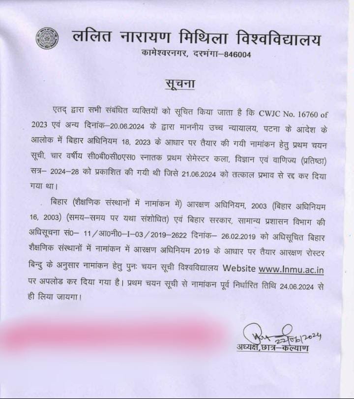 दोस्तों आप सभी की जानकारी के लिए बता दे, ललित नारायण मिथिला यूनिवर्सिटी के द्वारा अभी फिलहाल ऑफिशियल सूचना जारी कर जानकारी दी गई है| कि नामांकन प्रक्रिया पहले बताए गए तिथि अनुसार ही ली जाएगी| अर्थात 24 जून से ही शुरू होगी फर्स्ट सेमेस्टर नामांकन के लिए मेरिट लिस्ट जारी कर दी गई है| इच्छुक उम्मीदवार जो नामांकन लेना चाह रहे हैं और ऑनलाइन आवेदन किए हैं |वह सभी अपना नाम इस लिस्ट में चेक करके कंफर्म हो जाएंगे कि किस कॉलेज के लिए उन्हें चुना गया है फिर उसे कॉलेज में जाकर उन्हें ऑफलाइन डॉक्यूमेंट लगाकर नामांकन लेना होगा| नामांकन के समय कौन-कौन सा डॉक्यूमेंट आपको ले जाना है,और इसके अलावा आपको क्या Fees रह सकता है ,आगे जानिए|