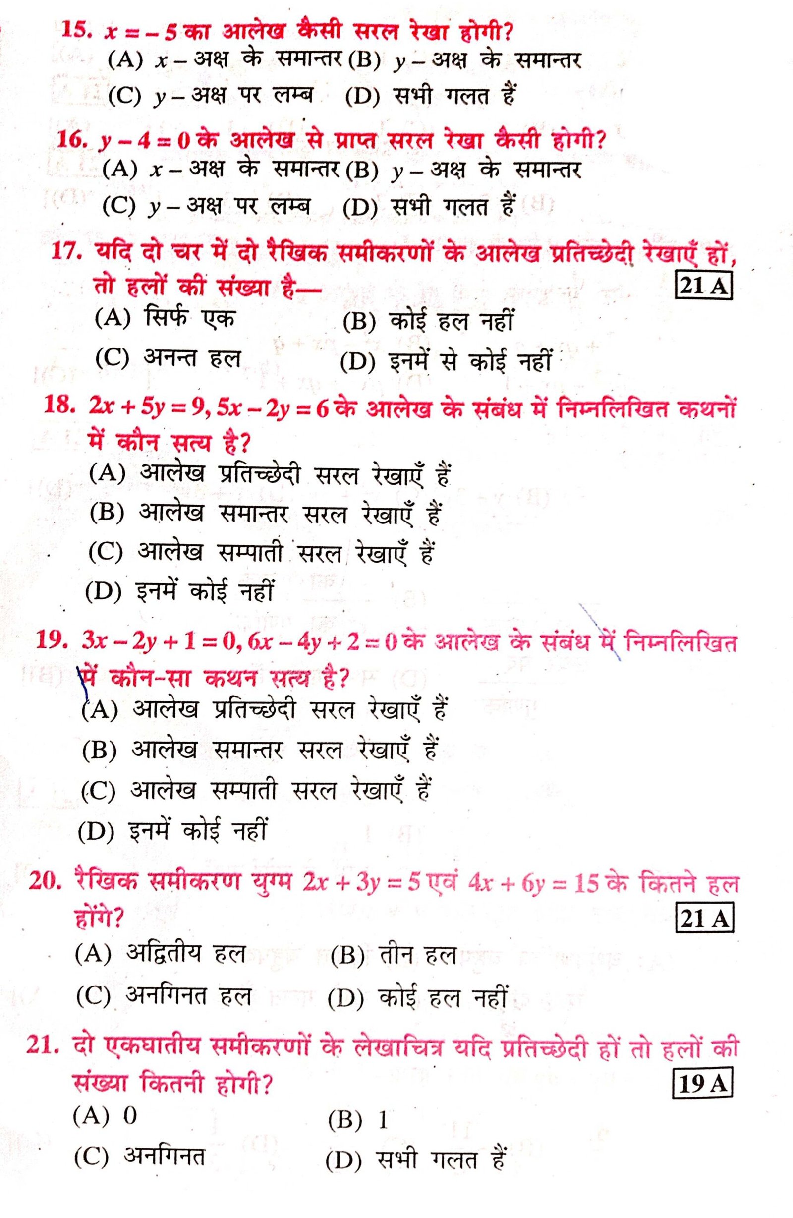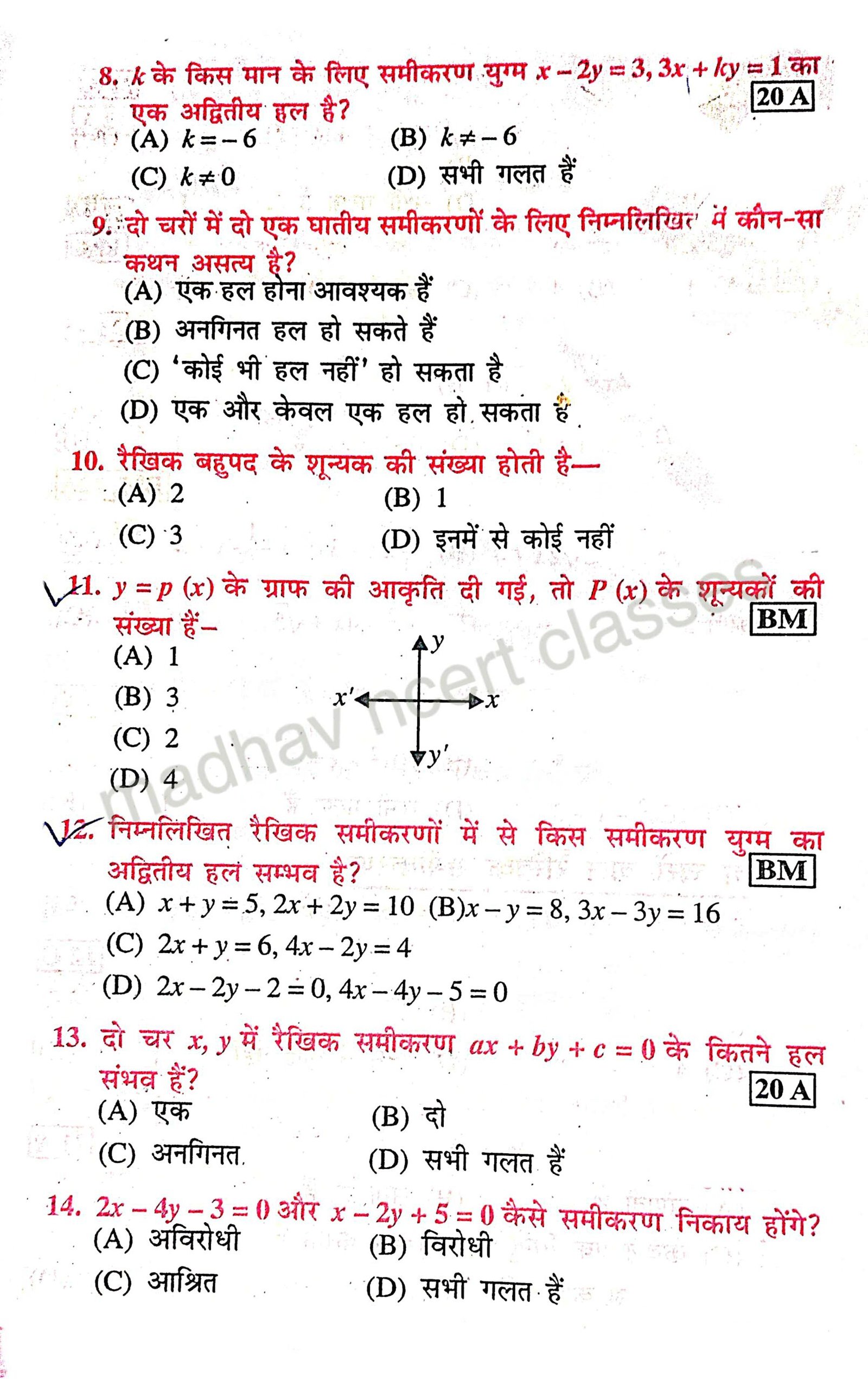 Class 10 math chapter-3 दो चर वाले रैखिक समीकरण युग्म important objective Question