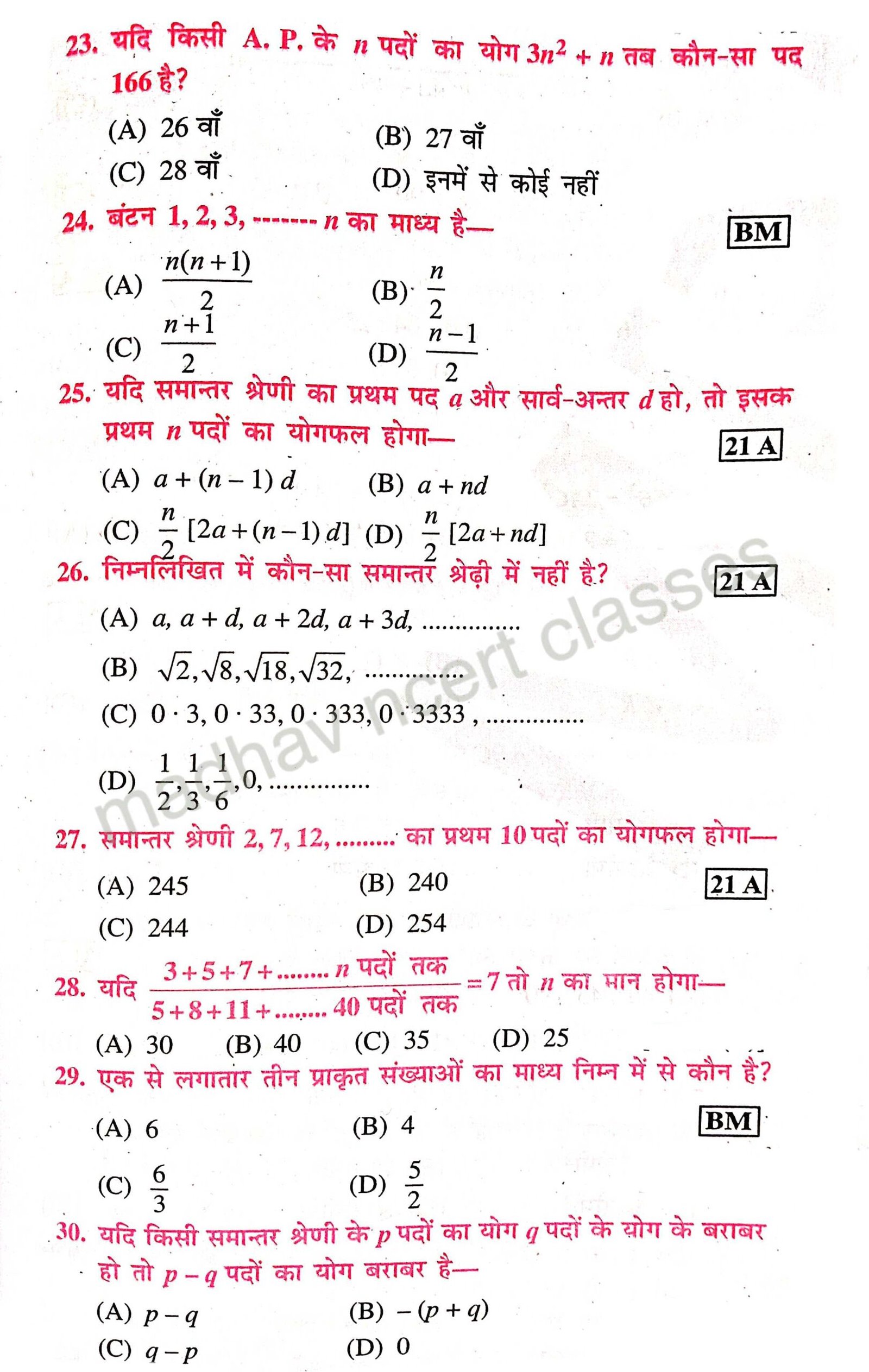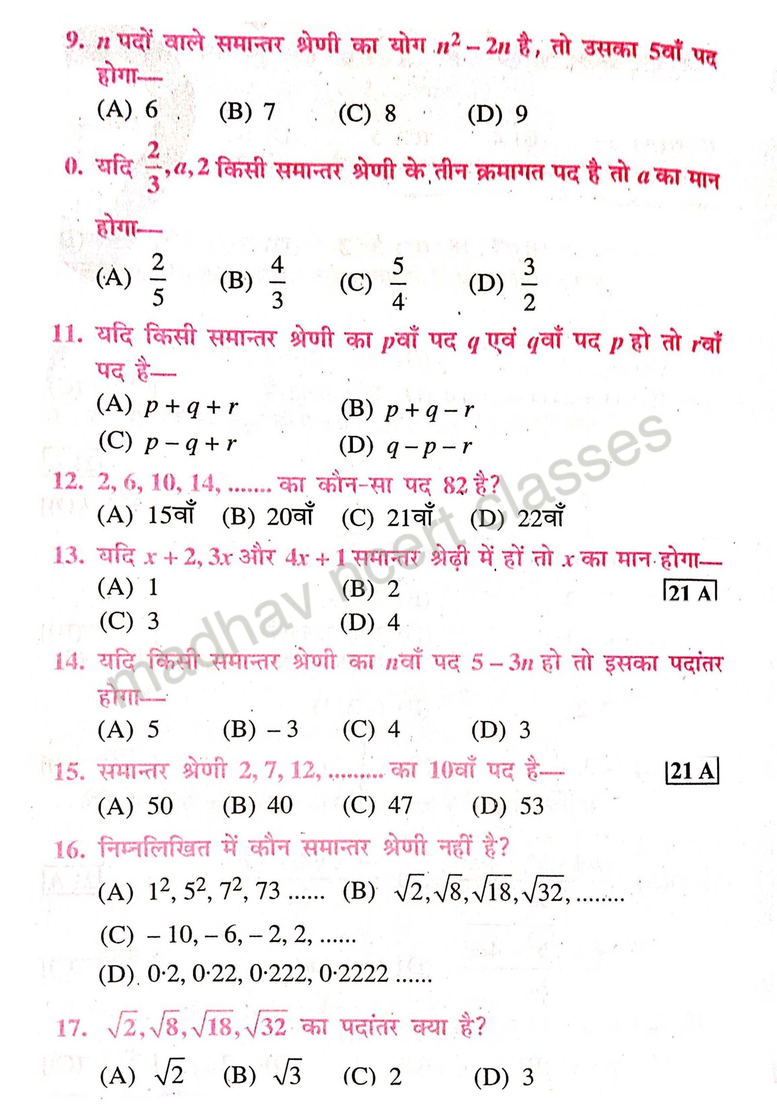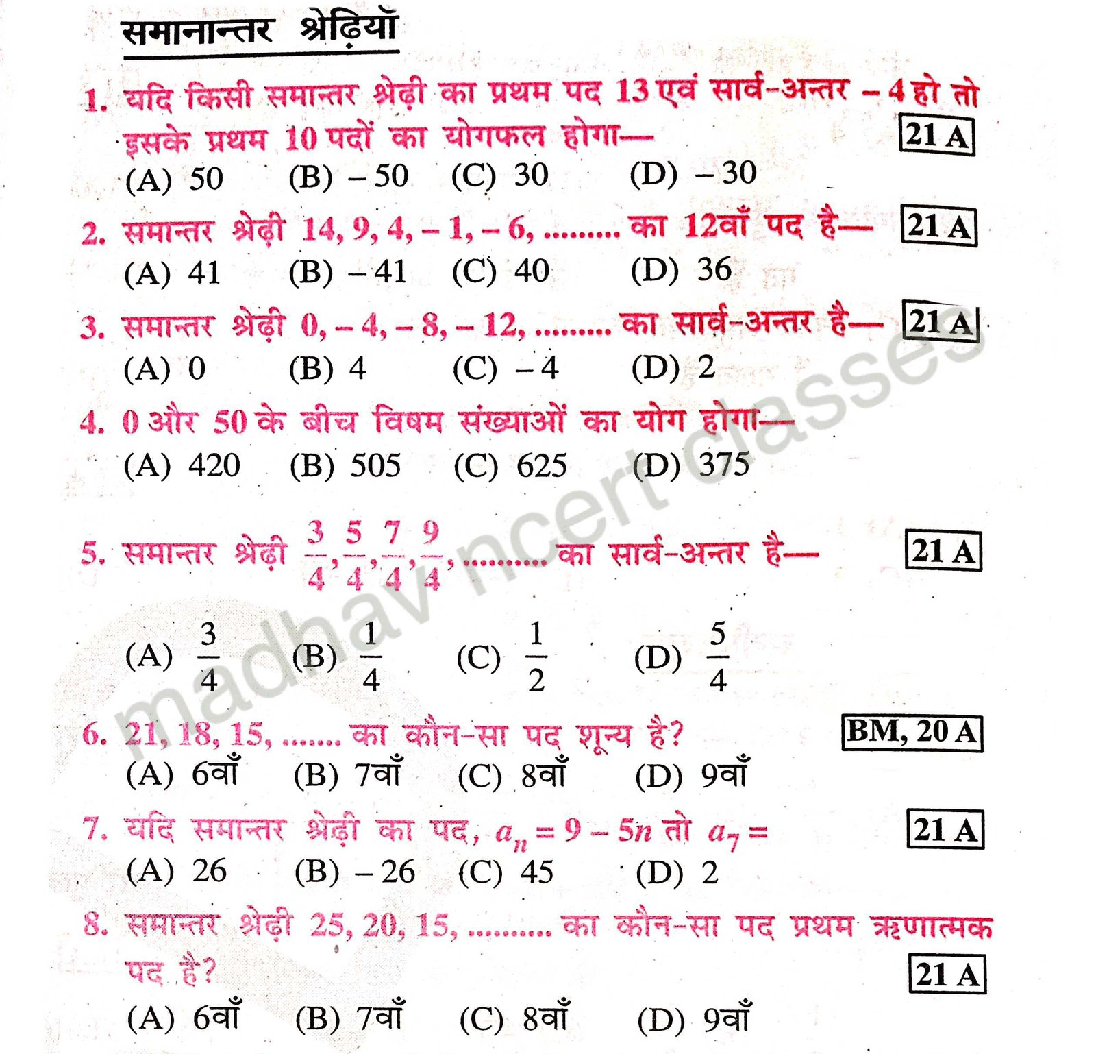Class 10,math chapter-5 समांतर श्रेढियाँ important objective Question,