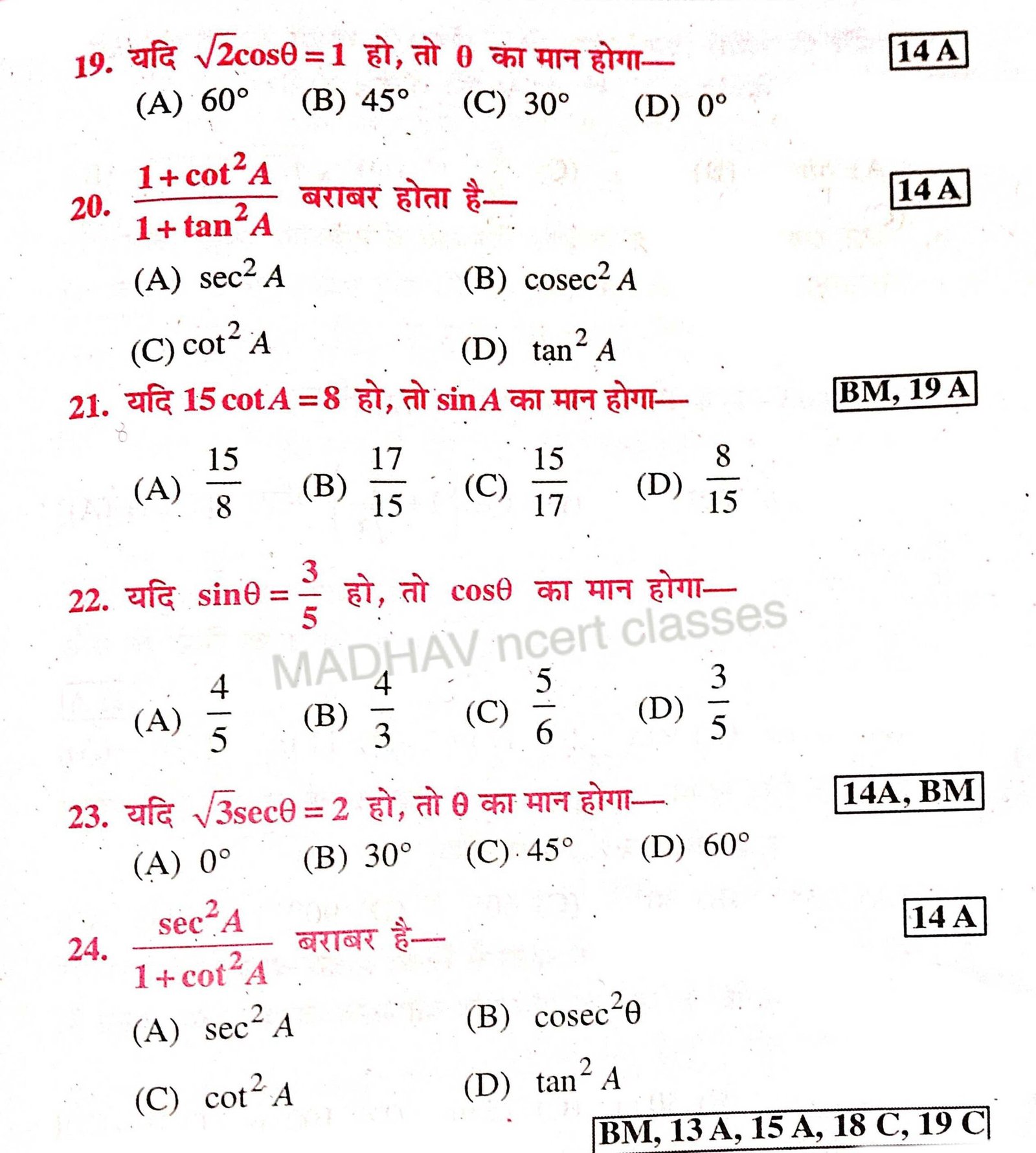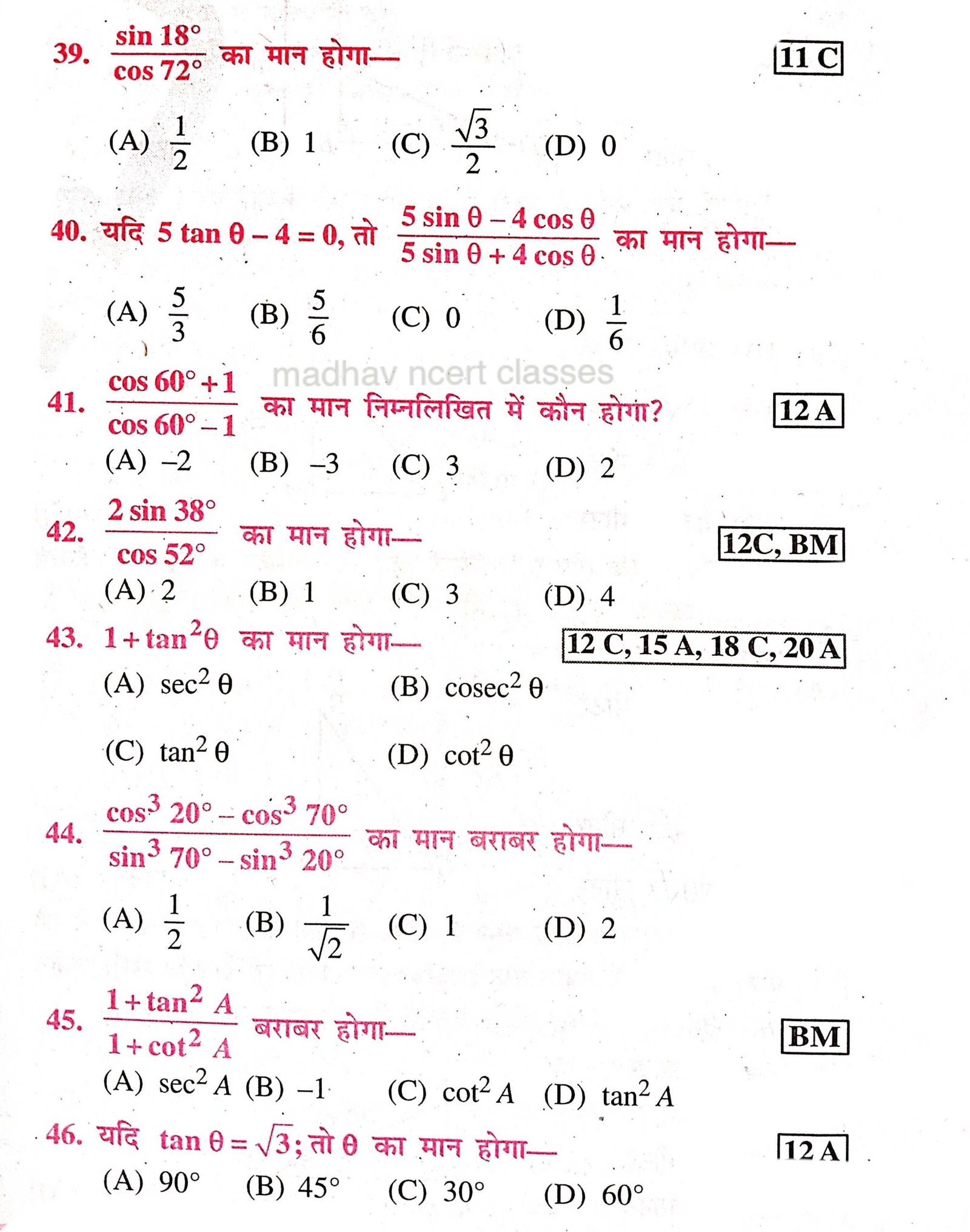 Class 10,math chapter-8 त्रिकोणमिति का परिचय important objective Question