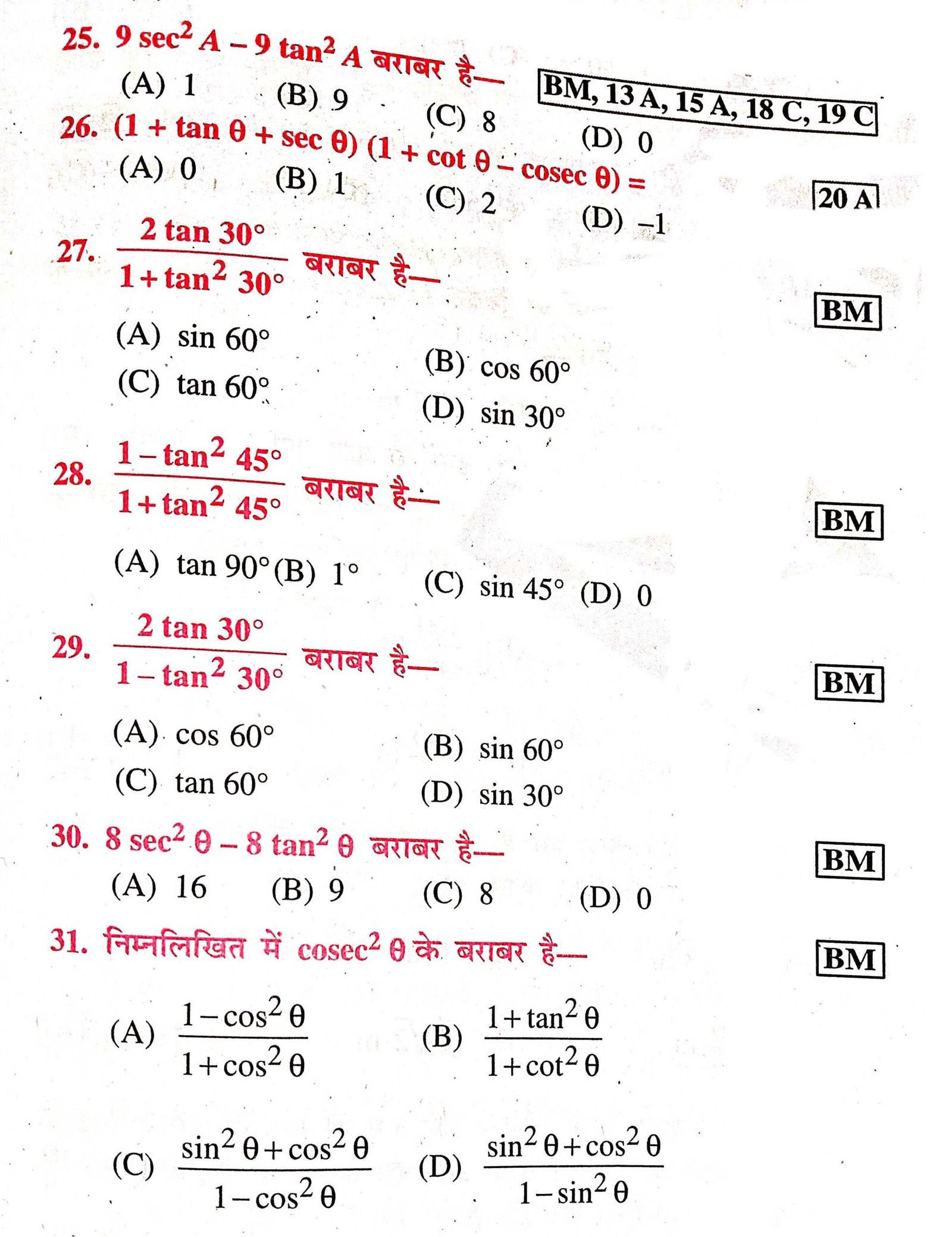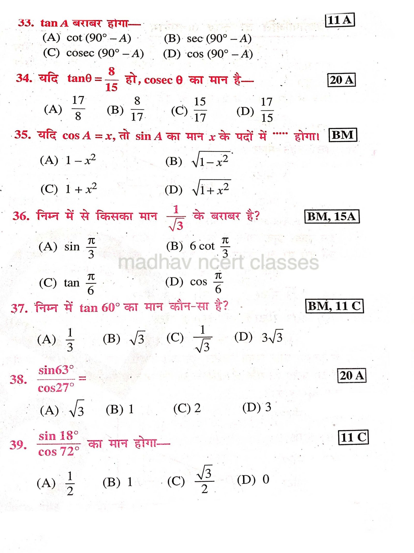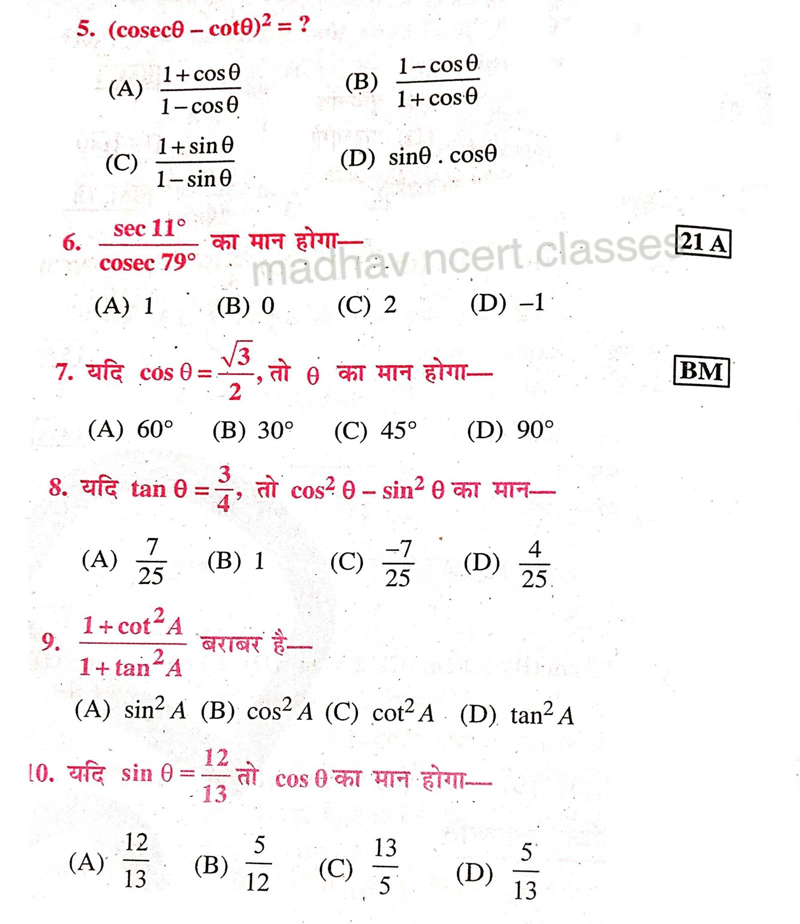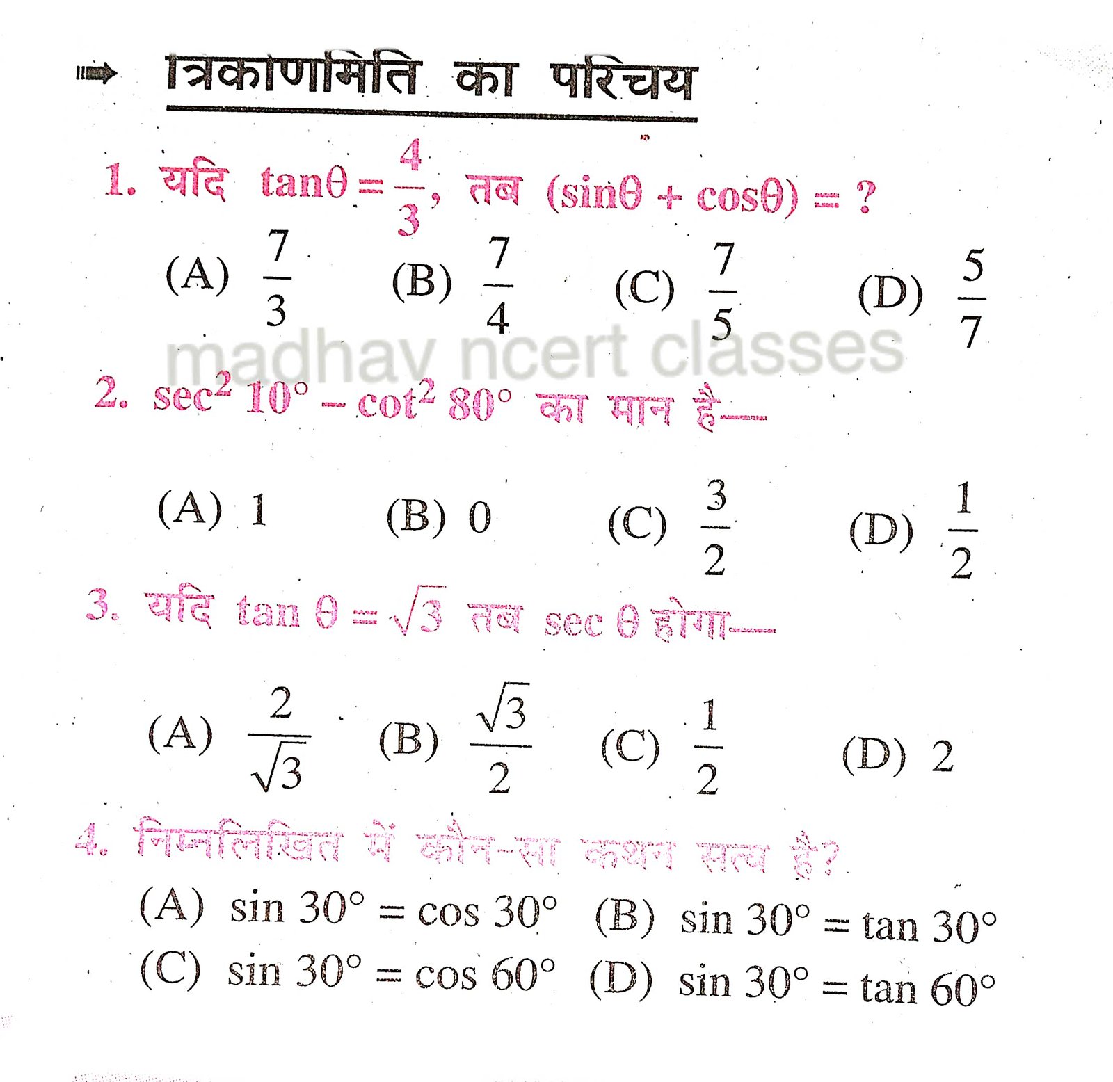 Class 10,math chapter-8 त्रिकोणमिति का परिचय important objective Question