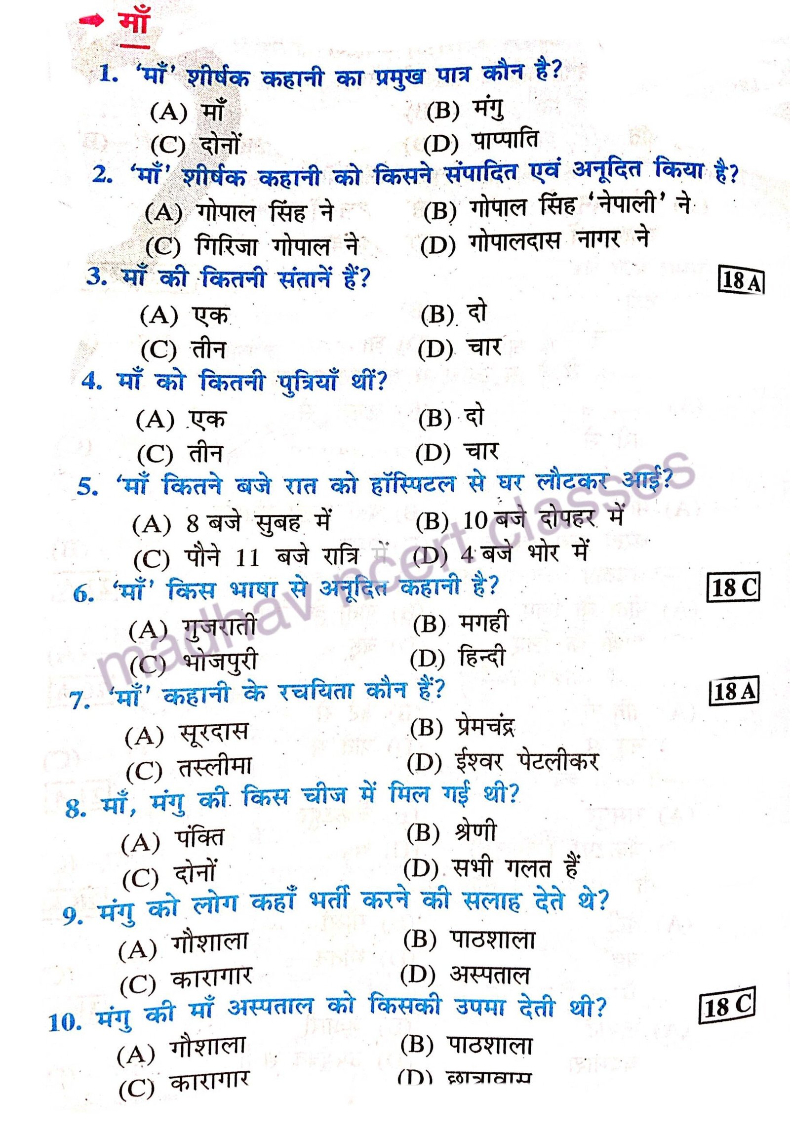 Class 10th, Hindi वर्णिका पाठ- 3 माँ All important question,