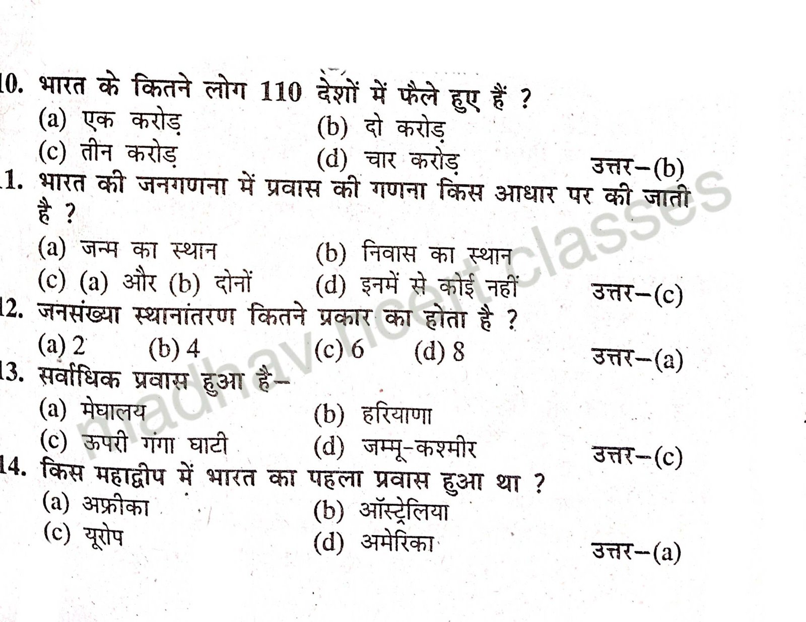 Class 12th Geography chapter-2 प्रवासः प्रकार, कारण और परिणाम All objective Question
