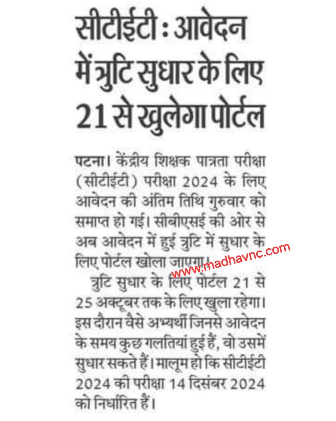 साथियों आप सभी के जानकारी के लिए बता दें- केंद्रीय माध्यमिक शिक्षक पात्रता परीक्षा जो 14 दिसंबर को ली जाएगी| इसके लिए जितने भी उम्मीदवार ऑनलाइन आवेदन कर चुके हैं| उन सभी के आवेदन में सुधार के लिए 25 अक्टूबर तक मौका दे दिया गया है|