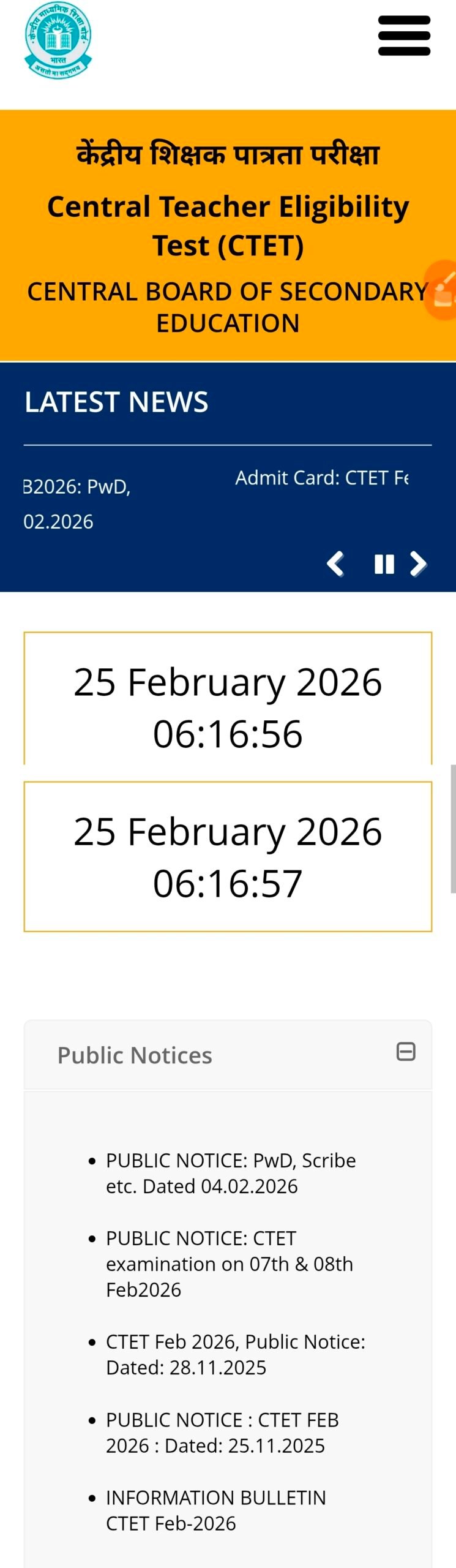 рдмреЛрд░реНрдб рдиреЗ рдЕрдм рд╕реАрдЯреАрдИрдЯреА рдкрд░реАрдХреНрд╖рд╛ (рдкреЗрдкрд░-II) 01.03.2026 (рд░рд╡рд┐рд╡рд╛рд░) рдХреЛ рдЙрдкрд░реНрдпреБрдХреНрдд рдХреЗрдВрджреНрд░реЛрдВ рдкрд░ рдЖрдпреЛрдЬрд┐рдд рдХрд░рдиреЗ рдХрд╛ рдирд┐рд░реНрдгрдп рд▓рд┐рдпрд╛ рд╣реИред рдЬрд┐рди рдЙрдореНрдореАрджрд╡рд╛рд░реЛрдВ рдХреЛ рдпреЗ рдХреЗрдВрджреНрд░ рдЖрд╡рдВрдЯрд┐рдд рдХрд┐рдП рдЧрдП рдереЗ, рдЙрдирдХреЗ рд▓рд┐рдП рд╕рдВрд╢реЛрдзрд┐рдд рдкреНрд░рд╡реЗрд╢ рдкрддреНрд░ рд╢реАрдШреНрд░ рд╣реА рдЙрдирдХреЗ рдЖрд╡реЗрджрди рд▓реЙрдЧрд┐рди рдореЗрдВ рдЙрдкрд▓рдмреНрдз рд╣реЛрдЧрд╛ред рдЙрдкрд░реНрдпреБрдХреНрдд рдХреЗрдВрджреНрд░реЛрдВ рдкрд░ рдЙрдкрд╕реНрдерд┐рдд рд╕рднреА рдЙрдореНрдореАрджрд╡рд╛рд░реЛрдВ рдХреЛ рд╕реВрдЪрд┐рдд рдХрд┐рдпрд╛ рдЬрд╛рддрд╛ рд╣реИ рдХрд┐ рд╡реЗ рд╕реАрдЯреАрдИрдЯреА рд╡реЗрдмрд╕рд╛рдЗрдЯ ctet.nic.in рдХреЗ рдорд╛рдзреНрдпрдо рд╕реЗ рдЕрдкрдиреЗ рдЖрд╡реЗрджрди рд▓реЙрдЧрд┐рди рд╕реЗ рд╕рдВрд╢реЛрдзрд┐рдд рдкреНрд░рд╡реЗрд╢ рдкрддреНрд░ рдбрд╛рдЙрдирд▓реЛрдб рдХрд░реЗрдВ рдФрд░ рдкрд░реАрдХреНрд╖рд╛ рдореЗрдВ рд╢рд╛рдорд┐рд▓ рд╣реЛрдВред рдпреЗ рдЙрдореНрдореАрджрд╡рд╛рд░ рдзреНрдпрд╛рди рджреЗрдВ рдХрд┐ рдЙрдиреНрд╣реЗрдВ рд╕реАрдЯреАрдИрдЯреА рдХреЗ 21рд╡реЗрдВ рд╕рдВрд╕реНрдХрд░рдг рдореЗрдВ рдкрд░реАрдХреНрд╖рд╛ рджреЗрдиреЗ рдХрд╛ рдХреЛрдИ рдФрд░ рдореМрдХрд╛ рдирд╣реАрдВ рджрд┐рдпрд╛ рдЬрд╛рдПрдЧрд╛ред рдкрд░реАрдХреНрд╖рд╛ рдХреЗрдВрджреНрд░ рдФрд░ рддрд┐рдерд┐ рдореЗрдВ рдкрд░рд┐рд╡рд░реНрддрди рдХреЗ рдЕрдиреБрд░реЛрдз рдХрд┐рд╕реА рднреА рдкрд░рд┐рд╕реНрдерд┐рддрд┐ рдореЗрдВ рд╕реНрд╡реАрдХрд╛рд░ рдирд╣реАрдВ рдХрд┐рдП рдЬрд╛рдПрдВрдЧреЗред