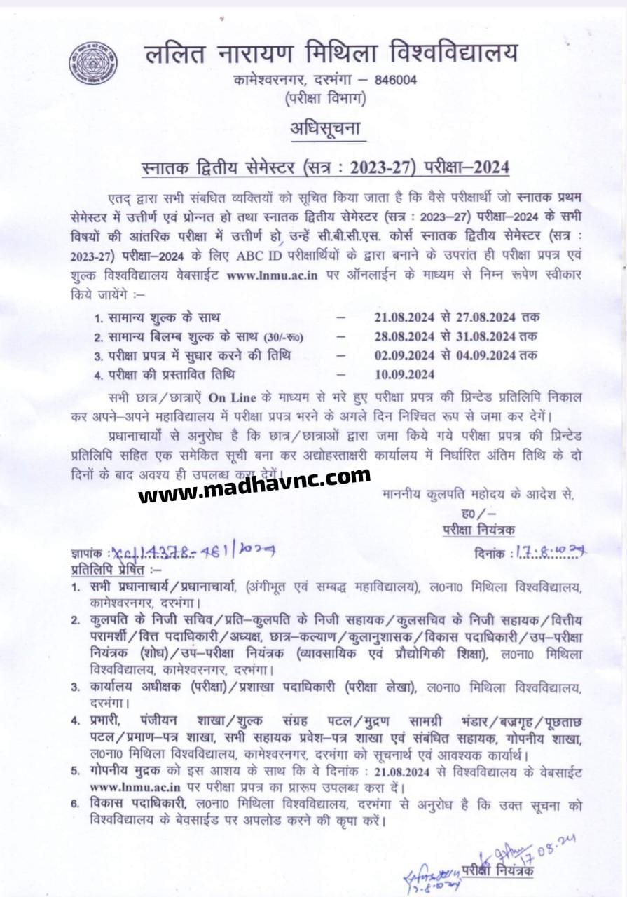 ललित नारायण मिश्रा यूनिवर्सिटी द्वारा 2nd Semester 2023 27 परीक्षा के लिए प्रवेश सूचना जारी कर दी गई है |जिसके अनुसार परीक्षा फॉर्म कब से भरा जाएगा | जुर्माने के साथ परीक्षा फॉर्म का मौका कब तक दिया गया है |