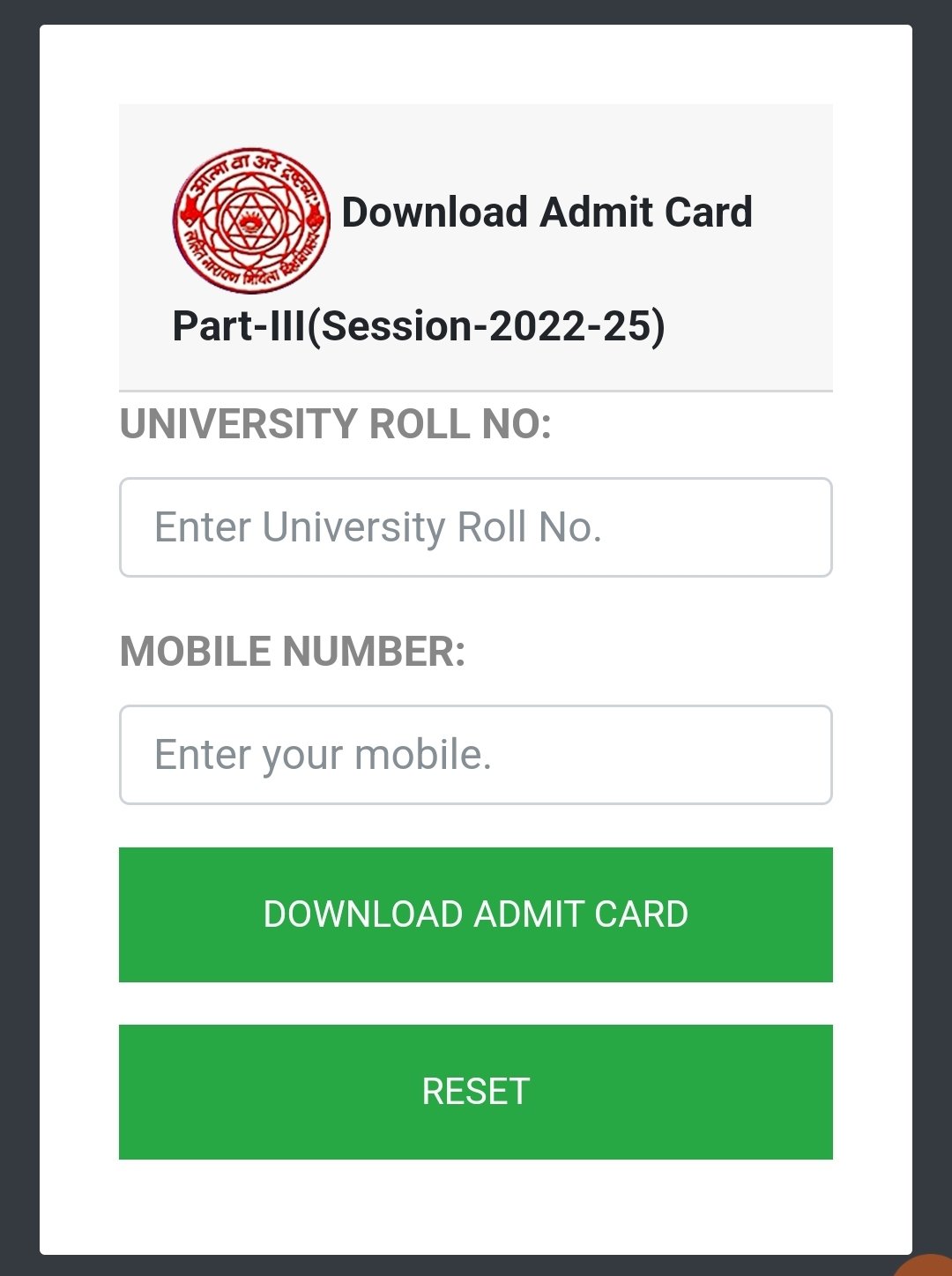 ●इसमें आपको सावधानी पूर्वक मोबाइल नंबर और यूनिवर्सिटी रोल नंबर डालना है, फिर आपको डाउनलोड एडमिट कार्ड वाले बटन पर क्लिक करना है| जैसे वहां पर आप क्लिक करेंगे |