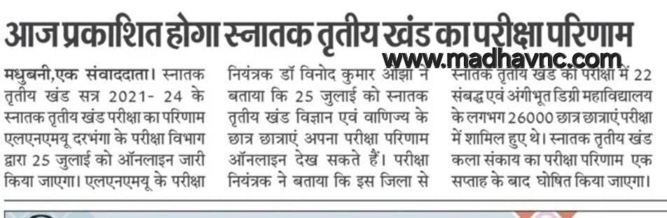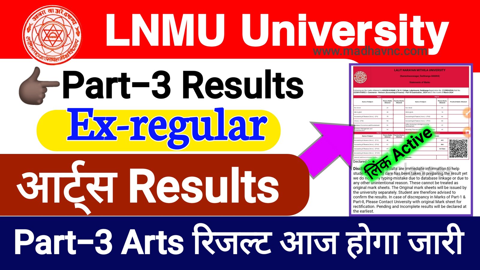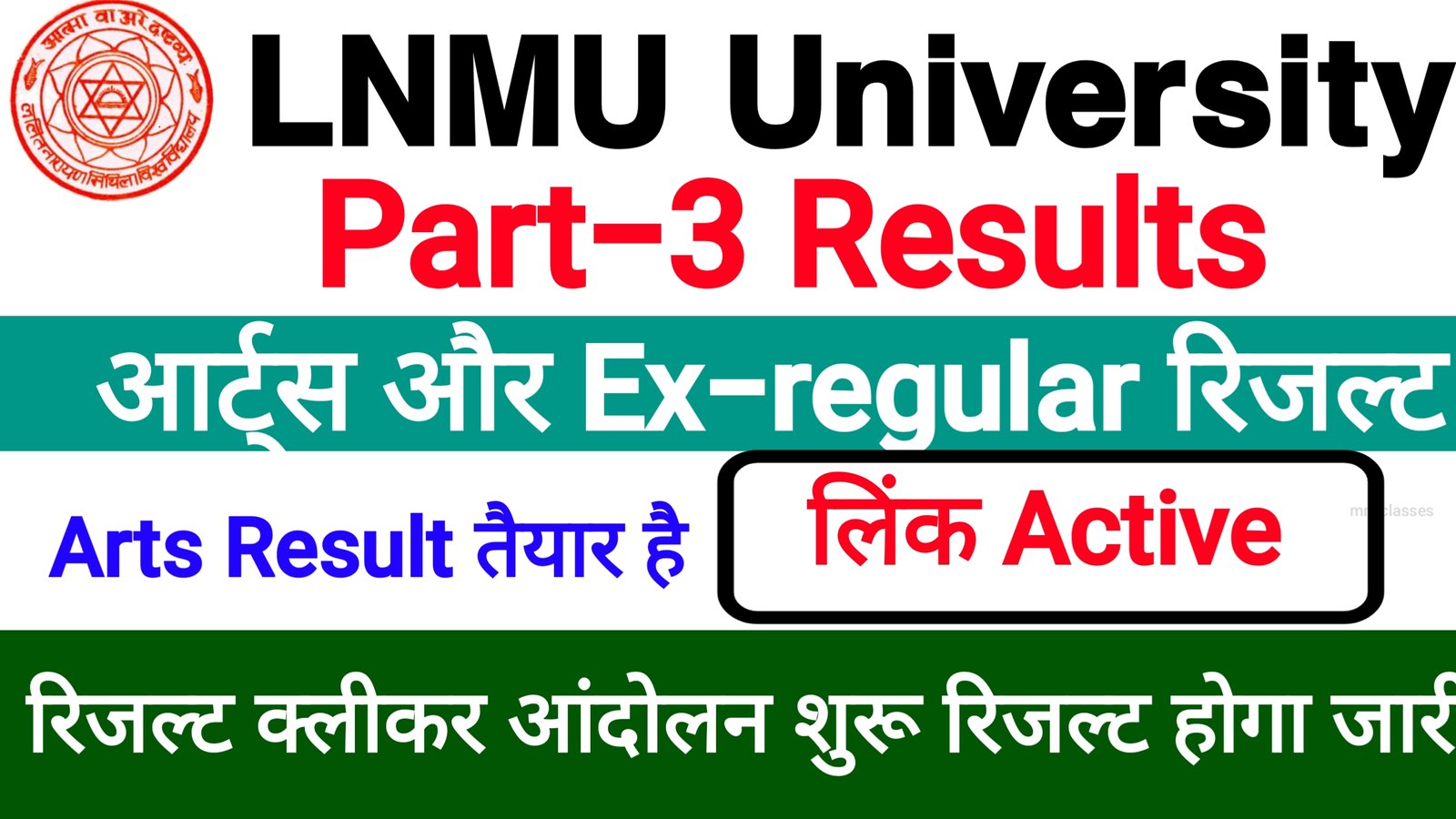 ललित नारायण मिथिला यूनिवर्सिटी के द्वारा स्नातक पार्ट 3 साइंस कॉमर्स एवं आर्ट्स का रिजल्ट जारी कर दिया है|  इसे आप ललित नारायण मिथिला यूनिवर्सिटी के ऑफिसियल वेबसाइट lnmu.ac.in से जाकर चेक कर सकते हैं | इसके अलावा आप इस आर्टिकल के नीचे दिए गए डायरेक्ट लिंक पर क्लिक करके भी अपना Part-3 Results 2021-24 चेक कर सकते हैं | From Lalit Narayan Mithila ग्रेजुएशन कर रहे बहुत सारे ऐसे छात्र हैं| जो ex रेगुलर के अंतर्गत आते हैं| यानी उन्होंने पीछे जो एग्जाम दिए, उसमें पास नहीं होने की वजह से उन्हें प्रमोटेड कर दिया गया था| जिसके वजह से उन्हें फिर से परीक्षा देना पड़ा |तो वैसे छात्र छात्राएं जो ex रेगुलर है ,और उनका रिजल्ट चेक नहीं हो पा रहा है |तो आपको घबराना नहीं है|