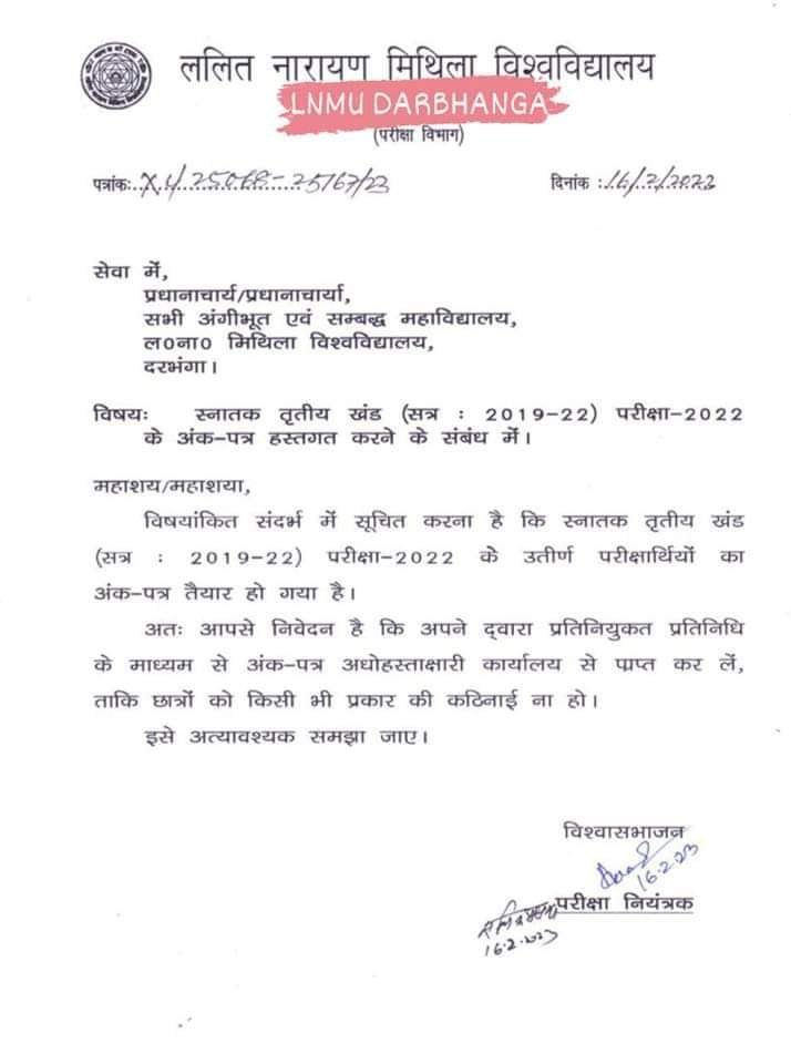 वही बताते चलें मिथिला यूनिवर्सिटी के द्वारा ऑफिशल नोटिफिकेशन जारी करते हुए बताया गया कि स्नातक तृतीय खंड का मार्कशीट महाविद्यालय भेजा जा रहा है संभवत 25 तारीख तक सभी महाविद्यालय में वितरित किया जाएगा बता दे यहां तक यह भी बताया गया कि जो छात्र उत्तीर्ण हुए हैं उन्हीं का अंकपत्र कॉलेज में भेजा जा रहा है बाकी छात्रों को अभी इंतजार करना होगा जैसे ही अपडेट आती है इस site पर आपको बता दिया जाएग।