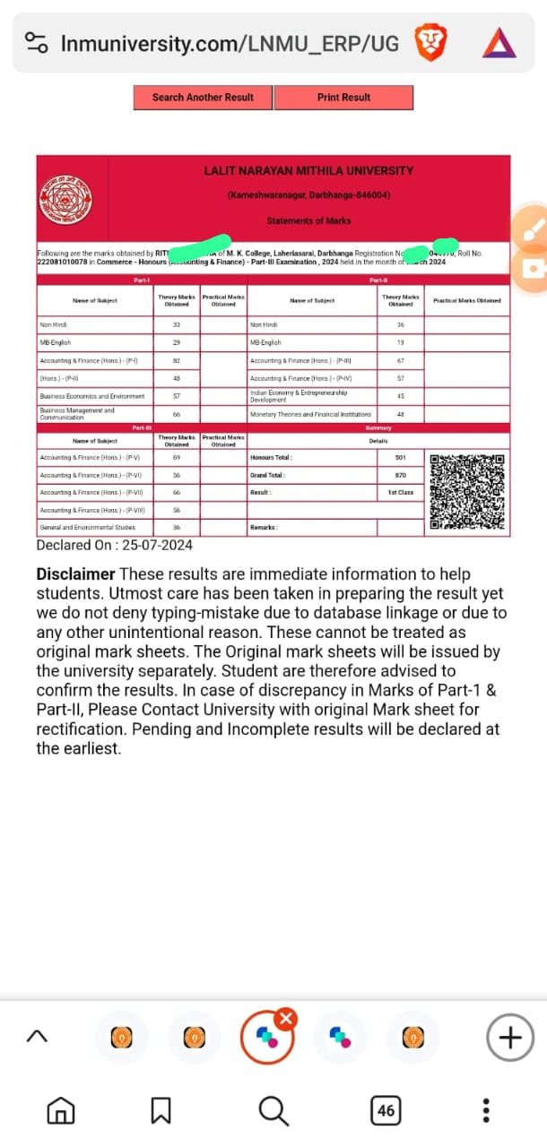ललित नारायण मिथिला यूनिवर्सिटी के द्वारा स्नातक पार्ट 1,2,3 सभी का सुधार के लिए भेजा गया |रिजल्ट सुधार करके वेबसाइट पर अपलोड कर दिया गया है |