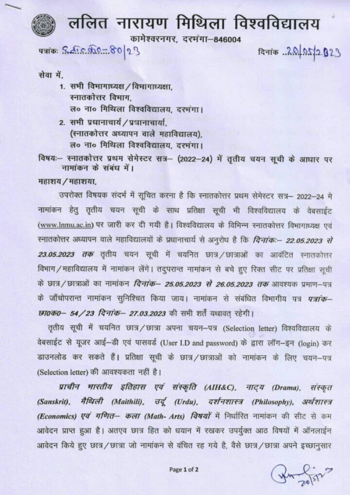 Lnmu pg 1st सेमेस्टर admission 2022-24 (स्नातकोत्तर पीजी) प्रथम सेमेस्टर सत्र 2022-24 में नामांकन को. तृतीय चयन सूची जारी कर दी गई है. तृतीय सूची के आधार पर चयनित छात्र छत्राएं अपने आवंटित कॉलेजों में दिनांक 22.05.2023 और 23.05.2023 तक नामांकन कराना सुनिश्चित करेंगे।
