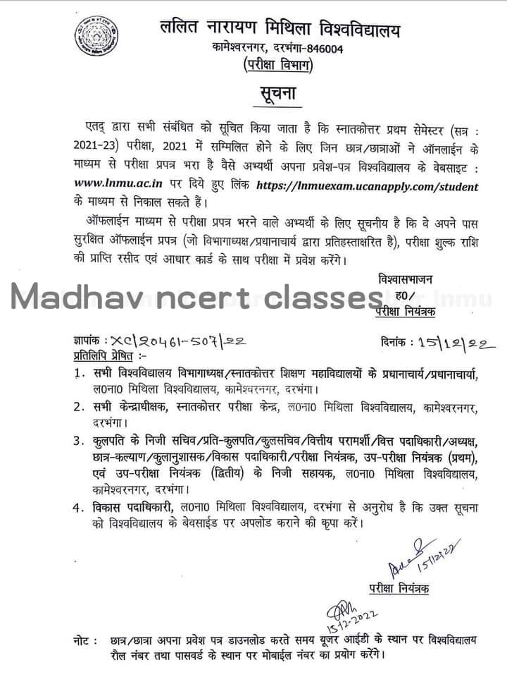 एतद् द्वारा सभी संबंधित को सूचित किया जाता है कि स्नातकोत्तर प्रथम सेमेस्टर ( सत्र : 2021-23 ) परीक्षा, 2021 में सम्मिलित होने के लिए जिन छात्र / छात्राओं ने ऑनलाईन के माध्यम से परीक्षा प्रपत्र भरा है वैसे अभ्यर्थी अपना प्रवेश-पत्र विश्वविद्यालय के वेबसाइट : www.Inmu.ac.in पर दिये हुए लिंक के माध्यम से निकाल सकते हैं।