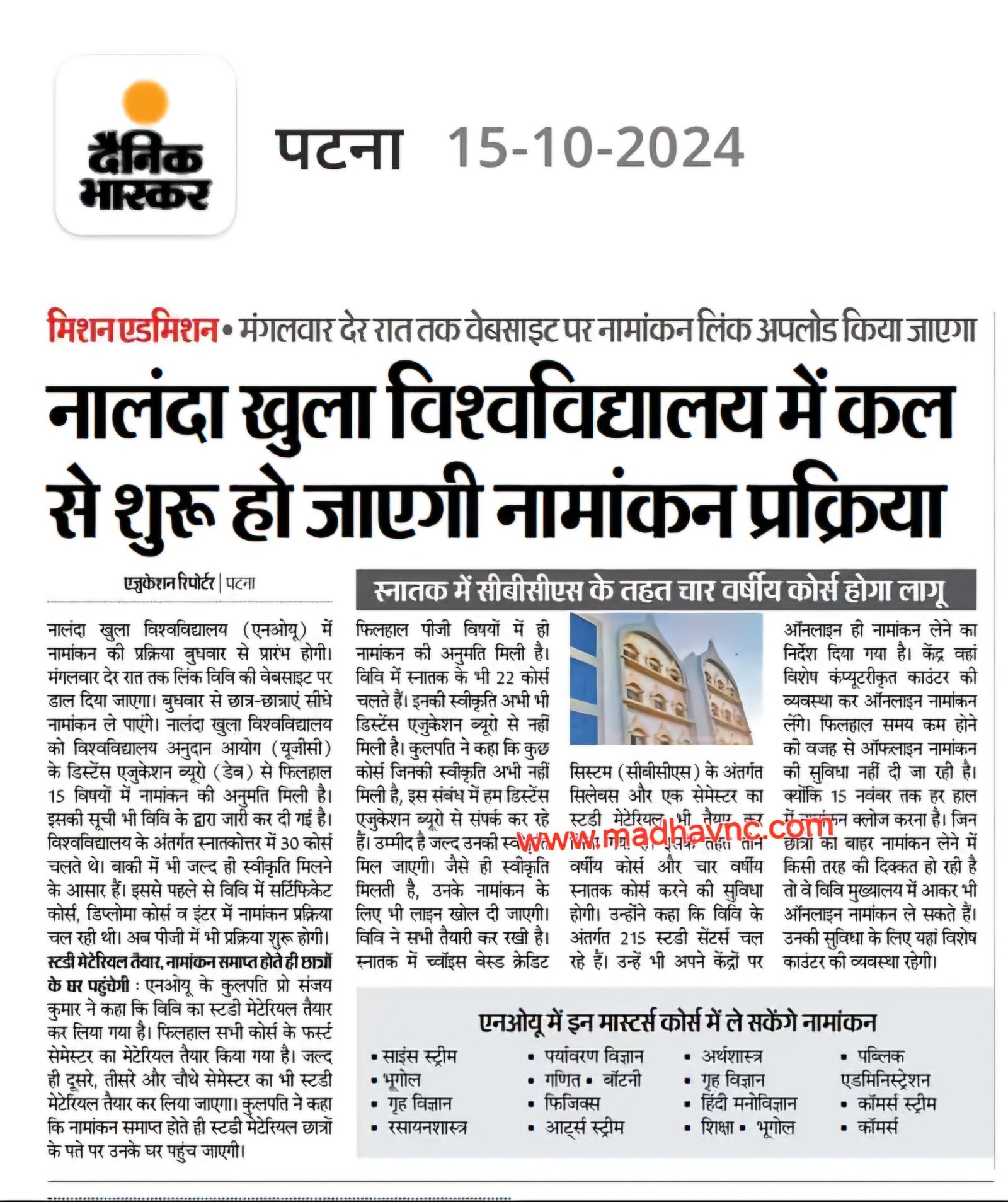 यदि मिथिला यूनिवर्सिटी में नहीं हो पता है ,तो नालंदा ओपन यूनिवर्सिटी में आप एडमिशन ले सकते हैं |परीक्षा की बात करते तो परीक्षा दोनों जगह समान रूप से ही ली जाएगी| जैसे कुछ लोगों का कहना होता है ,नालंदा अपने यूनिवर्सिटी में टाइट एग्जाम होगा तो आप लोग को बता देना चाहते हैं ,एक अच्छे विद्यार्थी ही अच्छे यूनिवर्सिटी से PG करते हैं, इसलिए आप लोग परीक्षा से भेज नहीं आराम से एडमिशन करा सकते हैं| अगर यहां नहीं होता है तो नालंदा ओपन यूनिवर्सिटी का दरबार आपके लिए खुले हुए हैं| वहां पर आवेदन की प्रक्रिया 16 नवंबर तक चल रही है |इसके जानकारी नीचे लिंक के माध्यम से देख सकते हैं|