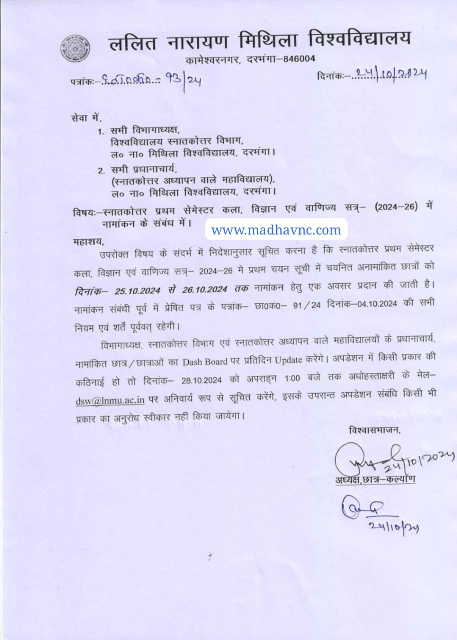 दोस्तों आप सभी के जानकारी के लिए बता दें| PG Admission 2024-26 पीजी ऐडमिशन की प्रक्रिया शुरू है| जिसमें प्रथम चयन सूची के आधार पर एडमिशन का अंतिम तिथि 19 अक्टूबर था| जिसे बढ़ाकर के 26 अक्टूबर तक किया गया,जो छात्र-छात्राएं अभी तक एडमिशन नहीं लिये हैं | प्रथम चयन में सिलेक्ट स्टूडेंट यदि अभी तक नामांकन नहीं ले पाए हैं, तो उन्हें अब आगे मौका नहीं दिया जाएगा | ललित नारायण मिथिला यूनिवर्सिटी के द्वारा पीजी ऐडमिशन के लिए सेकंड मेरिट लिस्ट तैयार की गई है| जिसे आज किसी भी समय जारी की जा सकती है| हालांकि इसके बारे में कोई ऑफिसर सूचना नहीं दी गई है |लेकिन पूर्व में जारी अधिसूचना के आधार पर 28 अक्टूबर यानी आज नामांकित छात्रों को डैशबोर्ड पर अपडेट किया जाना है| जिसके बाद सेकंड मेरिट लिस्ट प्रकाशित की जाएगी| नीचे ग्रुप का लिंक दिया गया है| आप लोग ग्रुप से जुड़ जाइए| जहां पर आपको सेकंड मेरिट लिस्ट का पीडीएफ देखने को मिलेगा, इसके अलावा सिलेक्शन लेटर डाउनलोड कैसे करेंगे| इसकी जानकारी नीचे दी गई है|