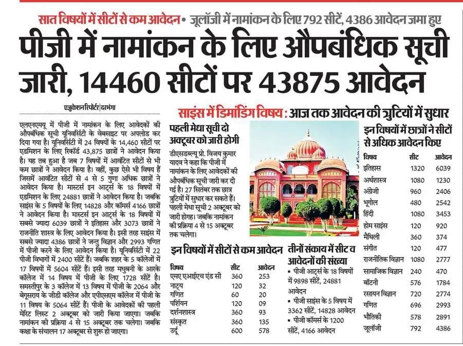 दोस्तों आप सभी की जानकारी के लिए बता दें ललित नारायण मिथिला यूनिवर्सिटी के द्वारा पीजी में नामांकन के लिए 27 सितंबर तक ऑनलाइन आवेदन का अंतिम रूप से मौका दिया गया था , जो अब समाप्त हो चुका है |