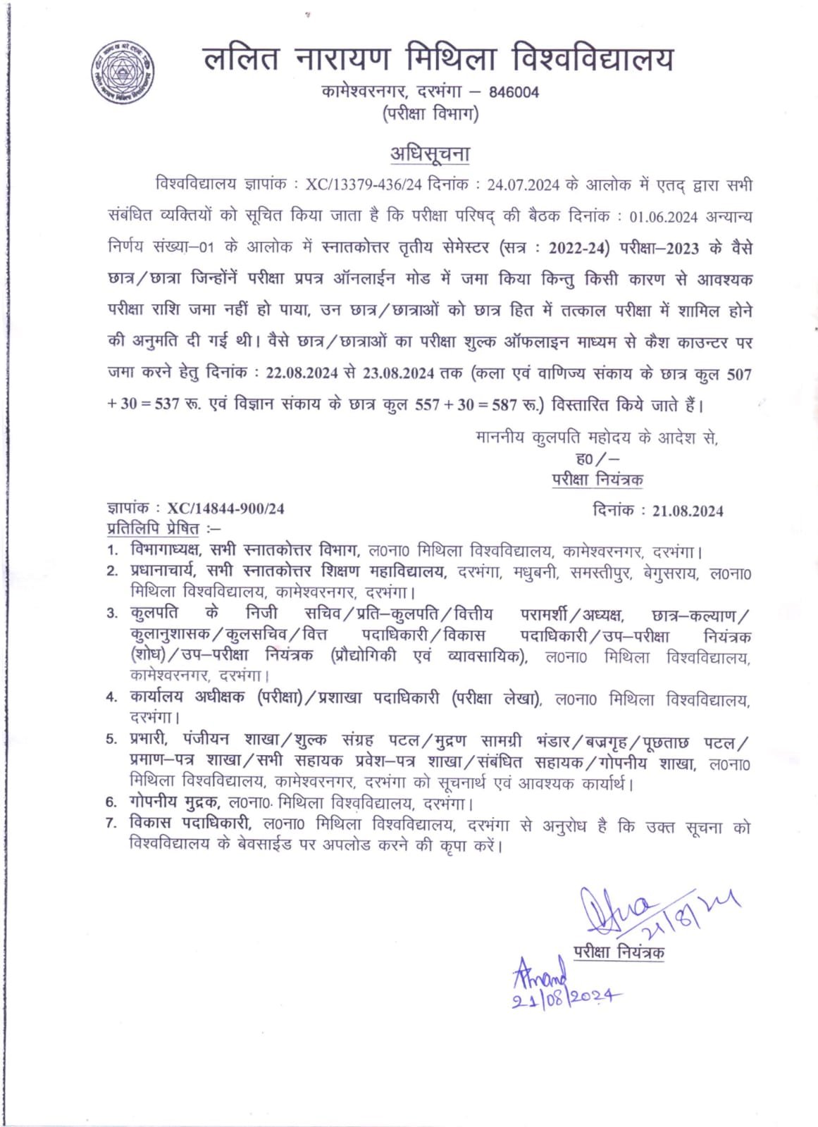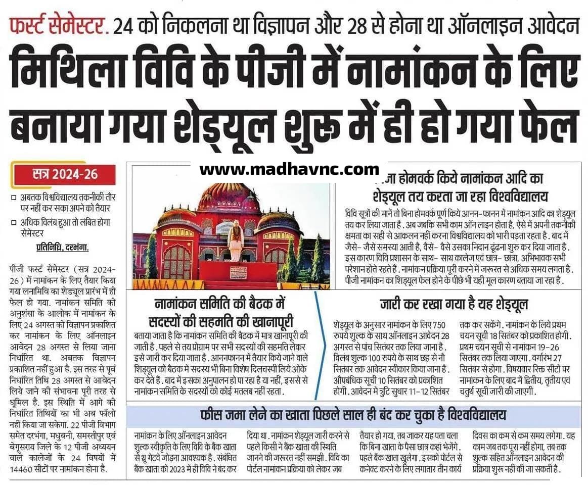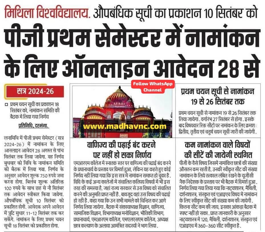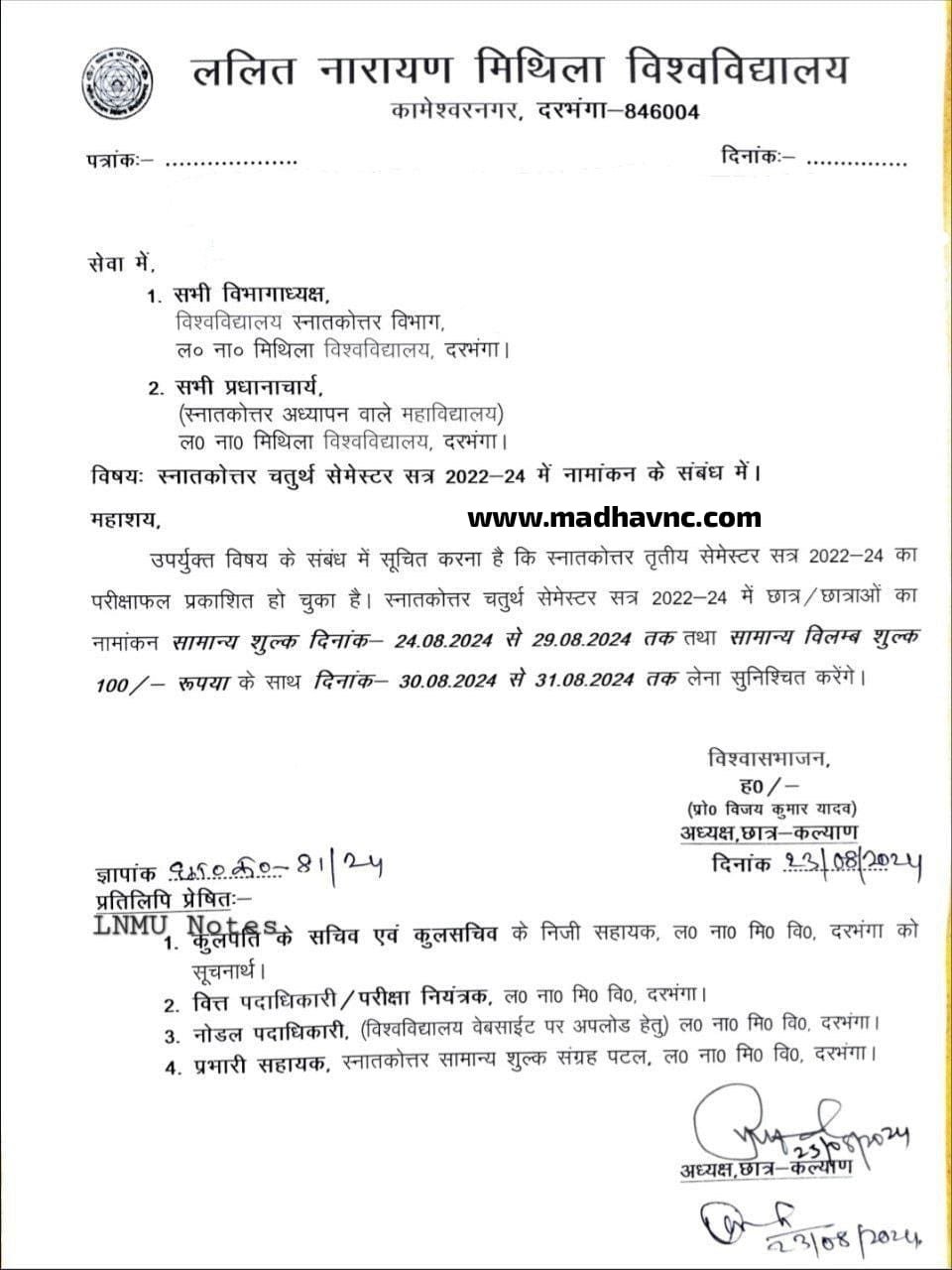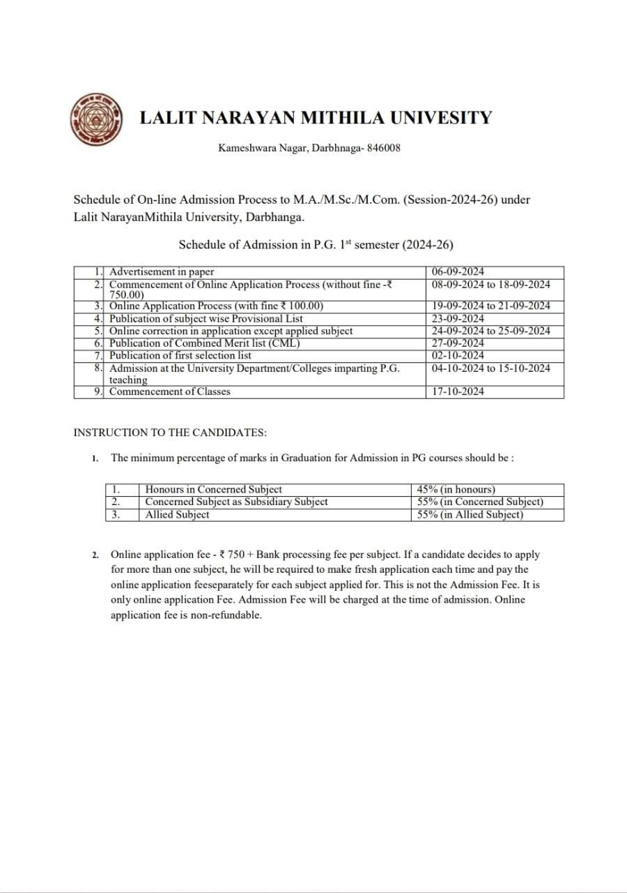 ललित नारायण मिथिला यूनिवर्सिटी के द्वारा पीजी फर्स्ट सेमेस्टर में नामांकन की प्रक्रिया के लिए ऑफिशियल सूचना जारी कर दी है| जिसके मुताबिक नामांकन की के लिए ऑनलाइन आवेदन की प्रक्रिया 28 अगस्त से शुरू हो रहा है | इसकी लेकर के आधिकारिक सूचना जारी की गई है| जो नीचे हम आपको विस्तार से बताएंगे|