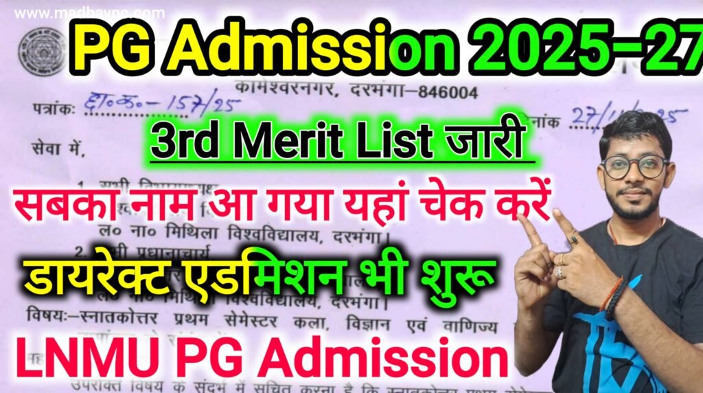 Pg Admission 2025-27 | PG डायरेक्ट एडमिशन कैसे पाएं ? MA Admission 2025-27 Online Apply Start LNMU PG Admission 2025-27 | 3rd Merit List Download Link Active | MA Admission Merit List जारी @lnmu.ac.in ललित नारायण मिथिला यूनिवर्सिटी के द्वारा स्नातकोत्तर एडमिशन के लिए अर्थात पीजी ऐडमिशन के लिए तीसरी चयन सूची … Continue reading LNMU PG Admission 2025-27 | 3rd Merit List Download Link Active | MA Admission Merit List जारी @lnmu.ac.in