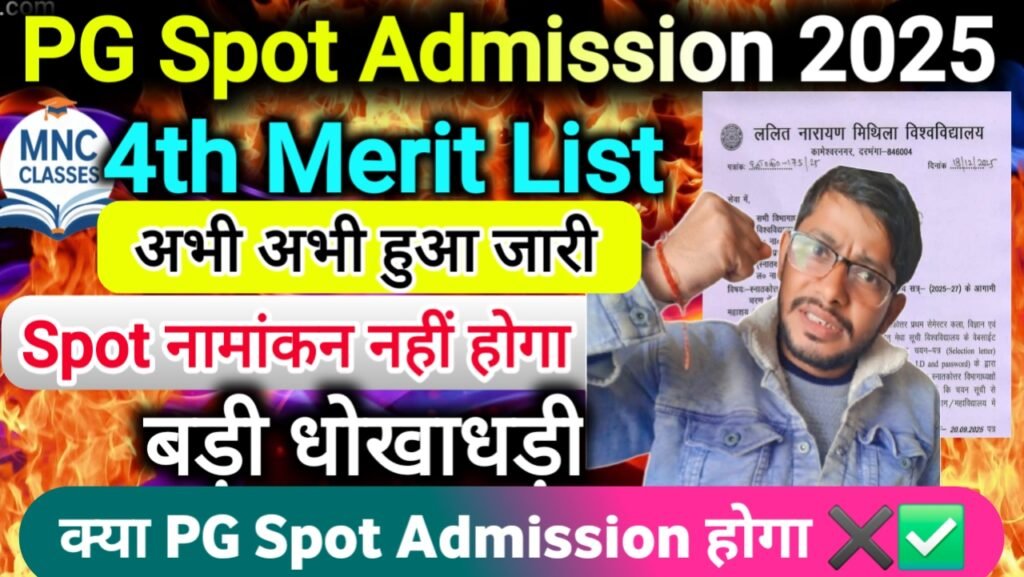 मिथिला यूनिवर्सिटी के द्वारा ग नामांकन के लिए जो चयन सूची जारी किया गया है | इसमें PG Spot Admission में ऑनलाइन किए गए किसी बच्चा का नाम नहीं आया है, अर्थात PG Spot Admission 2025-27 जो ऑनलाइन आवेदन लिया गया था, उसे रद्द कर दिया गया है |