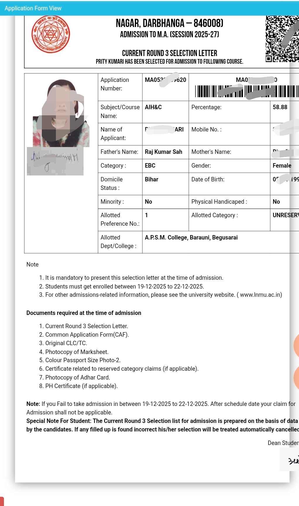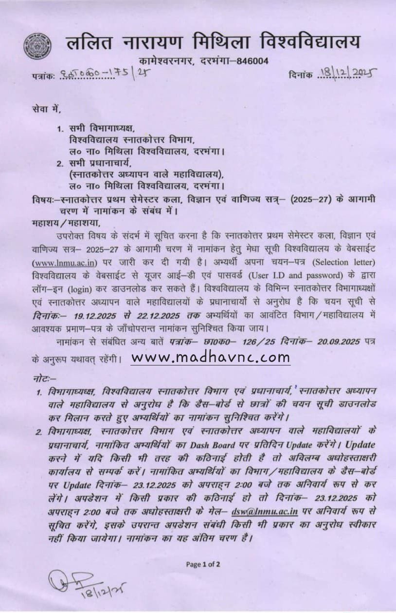 उपरोक्त विषय के संदर्भ में सूचित करना है कि स्नातकोत्तर प्रथम सेमेस्टर कला, विज्ञान एवं वाणिज्य सत्र – 2025-27 के आगामी चरण में नामांकन हेतु मेधा सूची विश्वविद्यालय के वेबसाईट (www.lnmu.ac.in) पर जारी कर दी गयी है। अभ्यर्थी अपना चयन – पत्र (Selection letter) विश्वविद्यालय के वेबसाईट से यूजर आई डी एवं पासवर्ड (User ID and password) के द्वारा लॉग-इन (login) कर डाउनलोड कर सकते हैं। विश्वविद्यालय के विभिन्न स्नातकोत्तर विभागाध्यक्षों एवं स्नातकोत्तर अध्यापन वाले महाविद्यालयों के प्रधानाचार्यों से अनुरोध है कि चयन सूची से दिनांक:- 19.12.2025 से 22.12.2025 तक अभ्यर्थियों का आवंटित विभाग / महाविद्यालय में आवश्यक प्रमाण-पत्र के जाँचोपरान्त नामांकन सुनिश्चित किया जाय ।