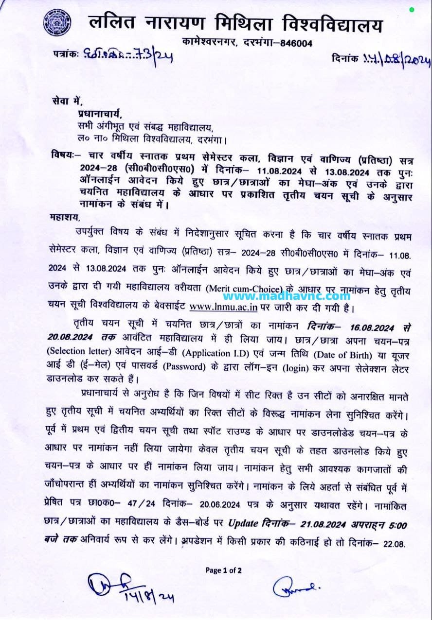 दिनांक- 11.08. 2024 से 13.08.2024 तक पुनः ऑनलाईन आवेदन किये हुए छात्र / छात्राओं का मेघा- अंक एवं उनके द्वारा दी गयी महाविद्यालय वरीयता (Merit cum-Choice) के आधार पर नामांकन हेतु तृतीय चयन सूची विश्वविद्यालय के बेवसाईट www.Inmu.ac.in पर जारी कर दी गयी है।