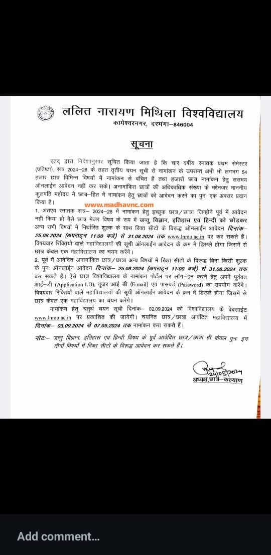 हेलो दोस्तों नमस्कार आप सभी का स्वागत है- ललित नारायण मिथिला यूनिवर्सिटी के एक नई अपडेट में इस अपडेट में हम बात करेंगे | यदि आप Lnmu Part 1 1st Semester Admission 2024 सेमेस्टर में Spot नामांकन नहीं कर पाए हैं, तो इसके लिए यूनिवर्सिटी के द्वारा अंतिम अवसर दिया गया है, जो आज से शुरू हो रहा है|