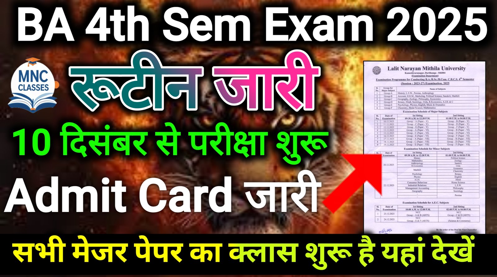नमस्कार साथियों आप सभी का स्वागत है- की नई आर्टिकल में इस आर्टिकल में आप जानने वाले हैं | ललित नारायण मिथिला यूनिवर्सिटी के द्वारा स्नातक 4th सेमेस्टर परीक्षा के लिए रूटिंग जारी कर दिए हैं | इस रूटिंग को आप आसानी से नीचे देख सकते हैं | CBCS UG 4th Semester Exam Routine के मुताबिक परीक्षा आपका 10 तारीख से आयोजन होने जा रहा है |यानी 10 दिसंबर से परीक्षा शुरू हो रहा है| मेजर पेपर का पहला परीक्षा होगा फिर अन्य पेपर का एग्जाम होगा | पेपर की बेहतर तैयारी के लिए आप इस आर्टिकल को पूरा पढ़ें|