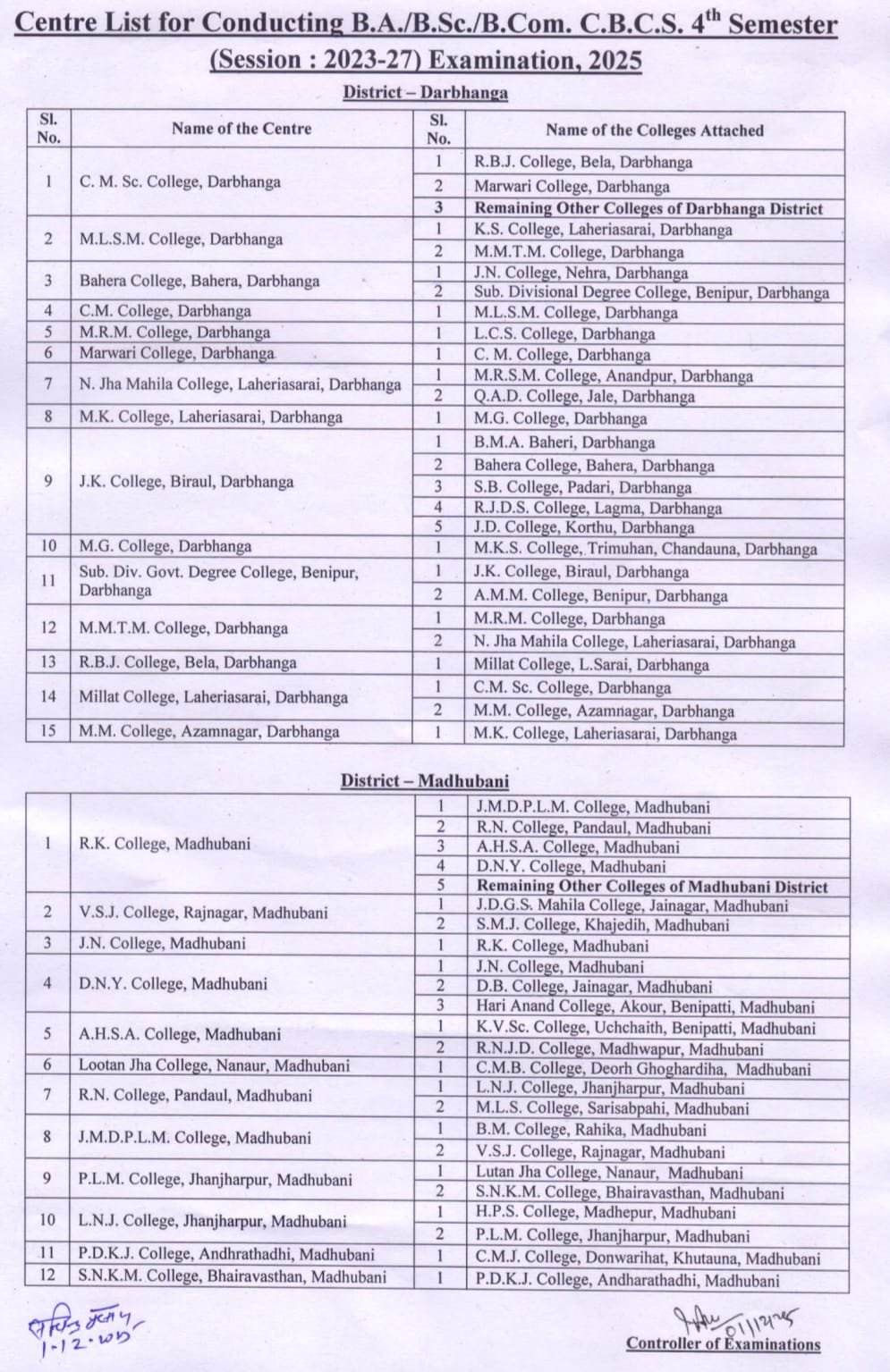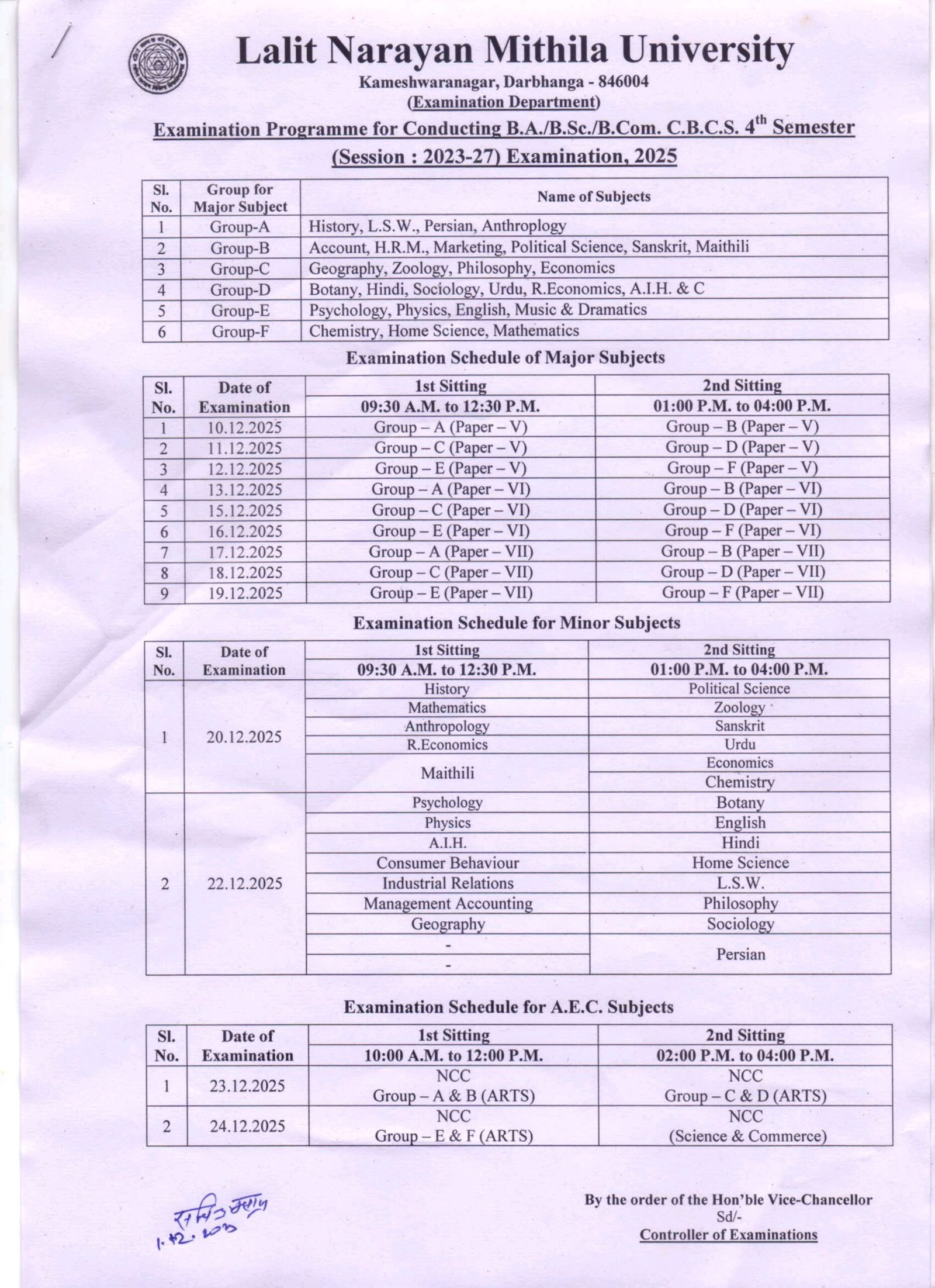 LNMU UG 4th Sem Exam 2023-27 परीक्षा रूटीन जारी कर दिया गया है| इस परीक्षा रूटीन के अनुसार 10 दिसंबर से परीक्षा शुरू हो रहा है | जबकि पूर्व जारी नोटिस के हिसाब से 8 दिसंबर से परीक्षा आयोजन होने की बात बताई जा रही थी | जो की फाइनल रूप से 10 दिसंबर डेट प्रकाशित की गई है नीचे रूटिंग दिया गया है और परीक्षा केंद्र की जानकारी है| एडमिट कार्ड कब होगा जारी| इसके लिए नीचे लिंक दिया गया है|