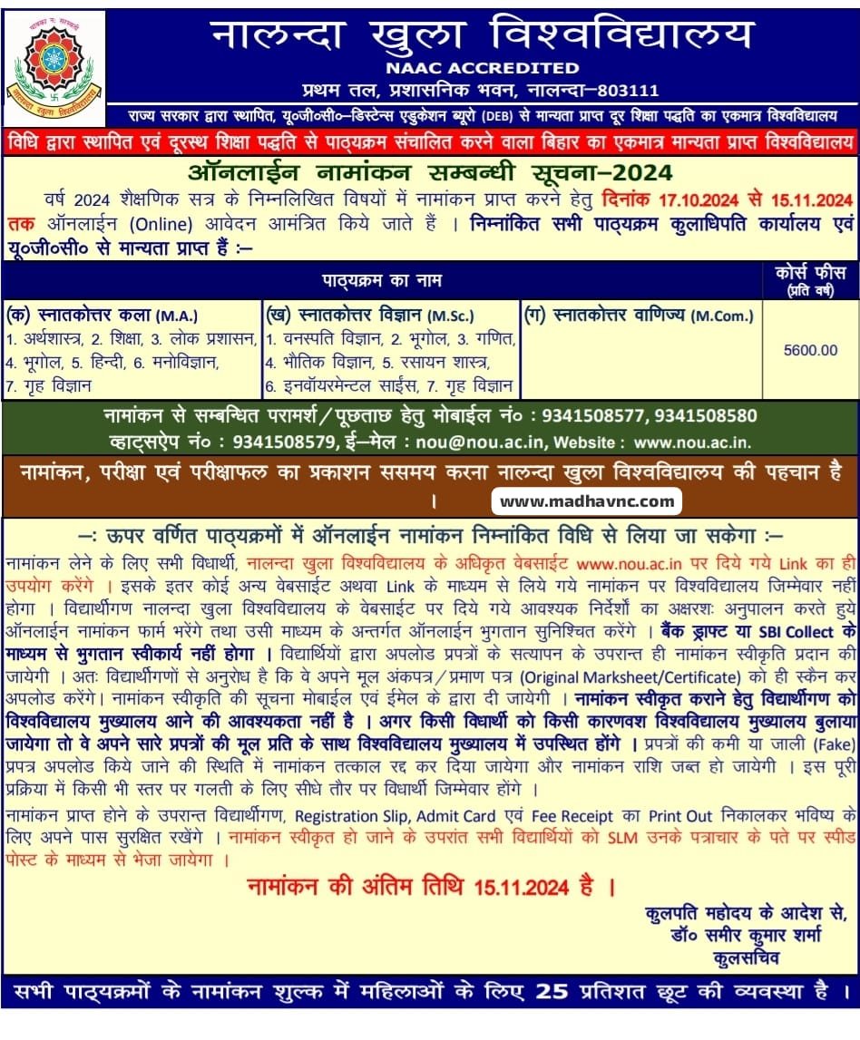 दोस्तों आप सभी की जानकारी के लिए बता दें पीजी में नामांकन लेना चाहते हैं, और ललित नारायण मिथिला यूनिवर्सिटी से आप आवेदन कर चुके थे | लेकिन मेरिट लिस्ट में यदि आपका नाम नहीं आया है, तो ऐसे छात्र-छात्राएं भी नालंदा खुला विश्वविद्यालय से पीजी में नामांकन ले सकते हैं| इसके ले करके आवेदन की प्रक्रिया शुरू कर दी गई है| जिसकी अंतिम तिथि 15 नवंबर तक है |