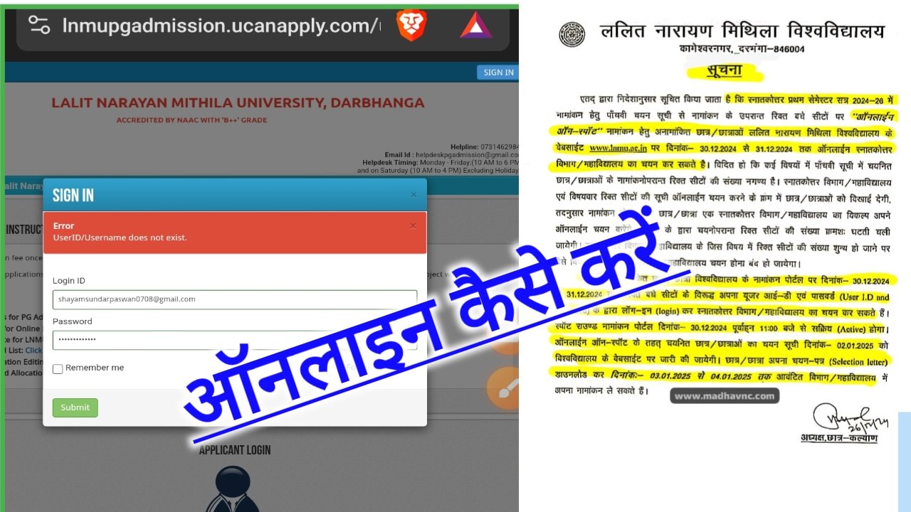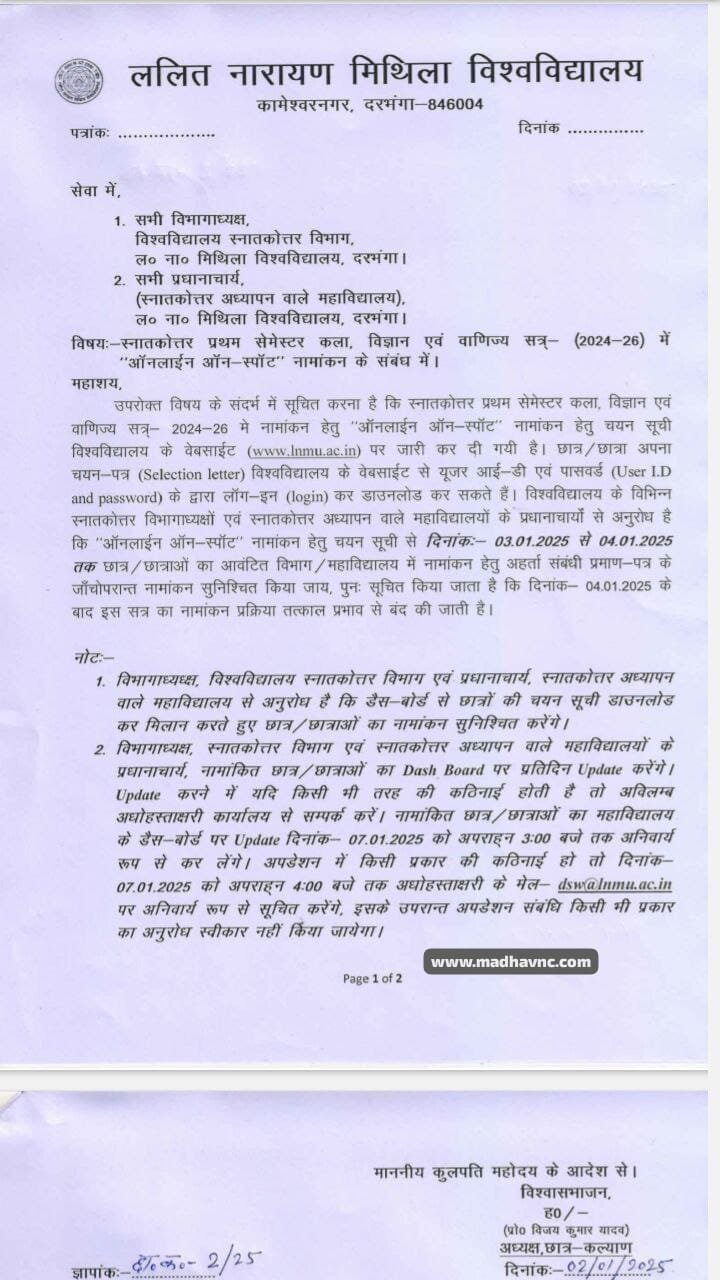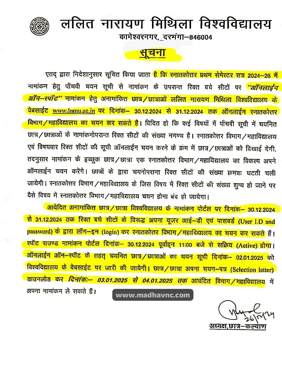 एतद् द्वारा निदेशानुसार सूचित किया जाता है कि स्नातकोत्तर प्रथम सेमेस्टर सत्र 2024-26 में नामांकन हेतु पाँचवी चयन सूची से नामांकन के उपरान्त रिवत बचे सीटों पर “ऑनलाईन ऑन-स्पॉट” नामांकन हेतु अनामांकित छात्र/छात्राओं ललित नारायण मिथिला विश्वविद्यालय के वेबसाईट www.lnmu.ac.in पर दिनांक 30.12.2024 से 31.12.2024 तक ऑनलाईन स्नातकोत्तर विभाग/महाविद्यालय का चयन कर सकते है। विदित हो कि कई विषयों में पाँचवी सूची में चयनित छात्र/छात्राओं के नामांकनोपरान्त रिक्त्त सीटों की संख्या नगण्य है। स्नातकोत्तर विभाग / महाविद्यालय एवं विषयवार रिक्त सीटों की सूची ऑनलाईन चयन करने के क्रम में छात्र/छात्राओं को दिखाई देगी, तदनुसार नामांकन के इच्छुक छात्र/छात्रा एक स्नातकोत्तर विभाग/महाविद्यालय का विकल्प अपने ऑनलाईन चयन करेंगे।